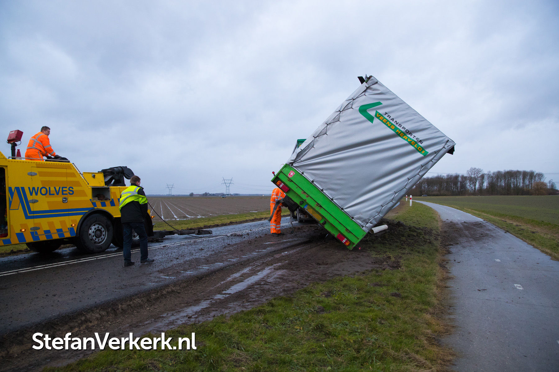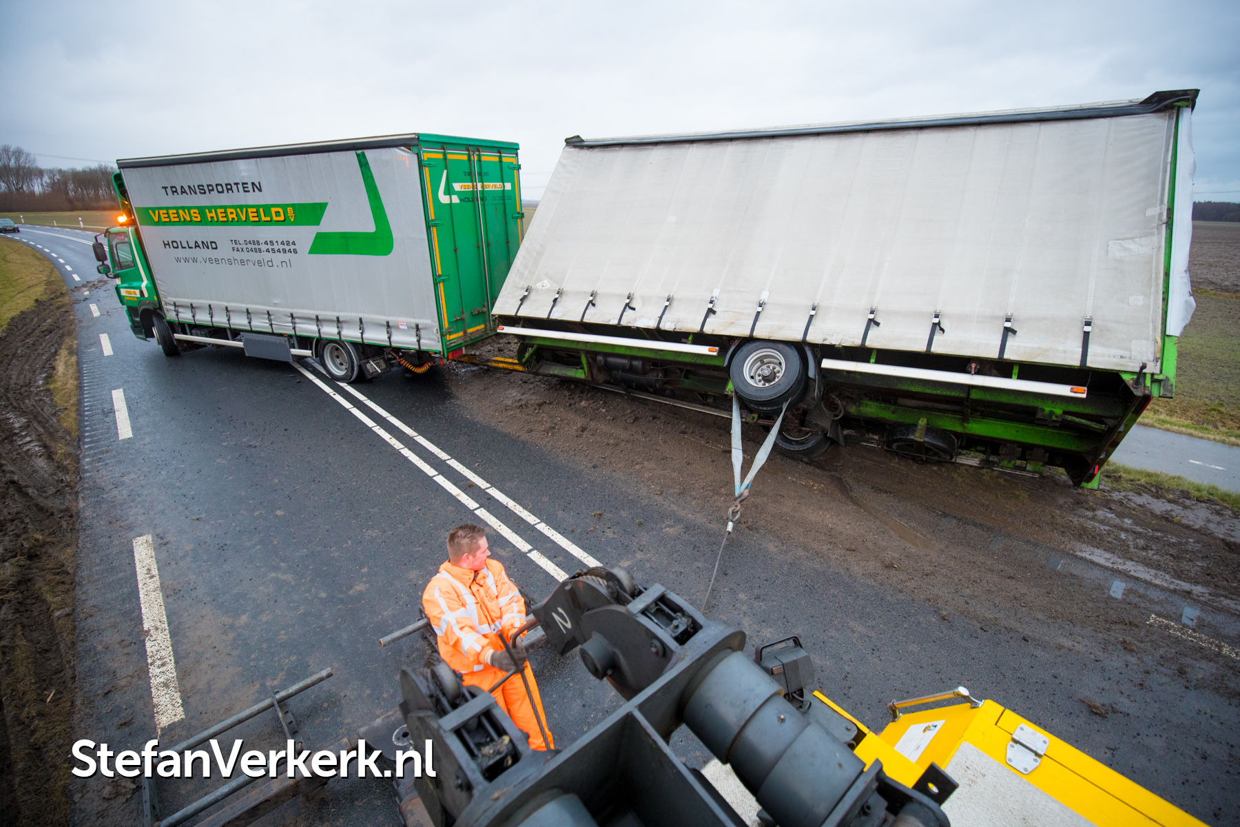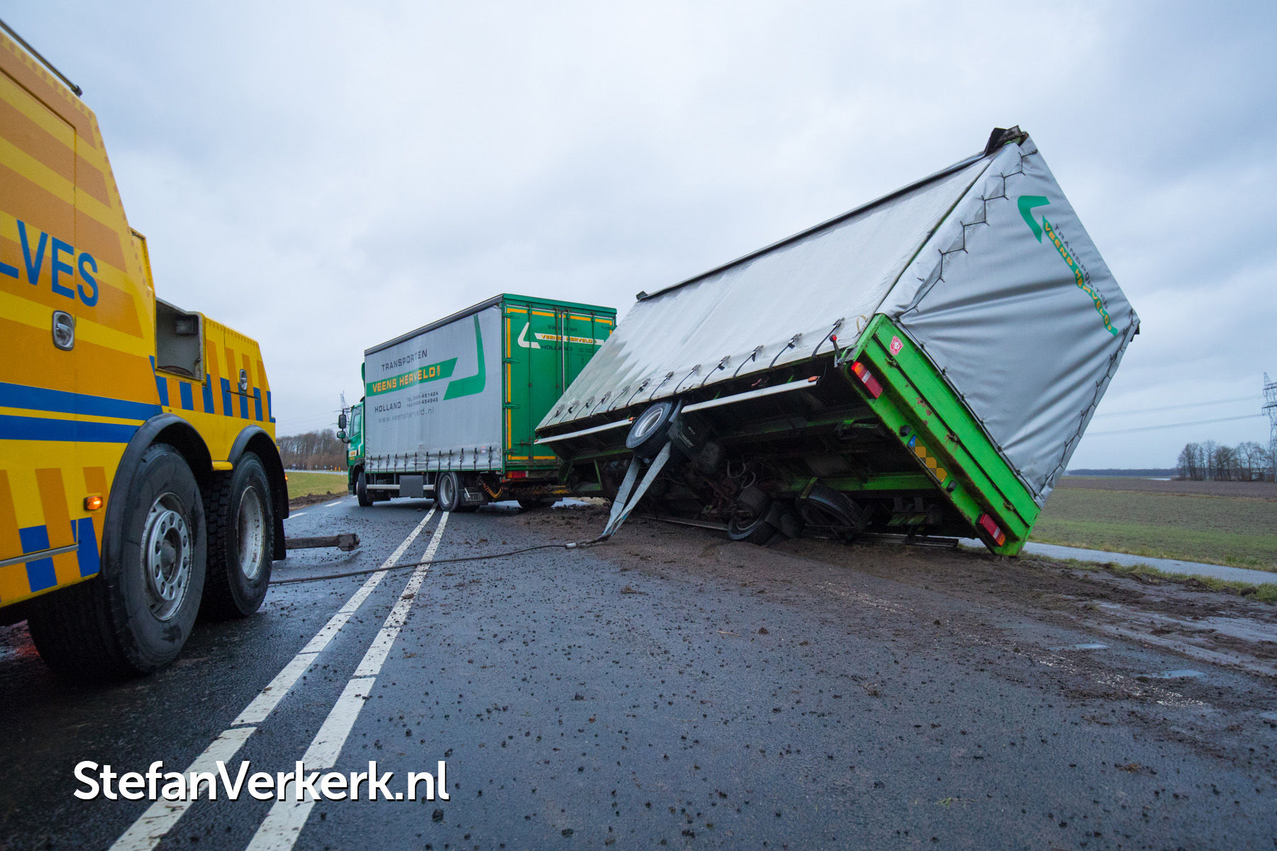 Foto's: Aanhanger vrachtwagen gekanteld door harde wind Elburgerweg N309 Dronten