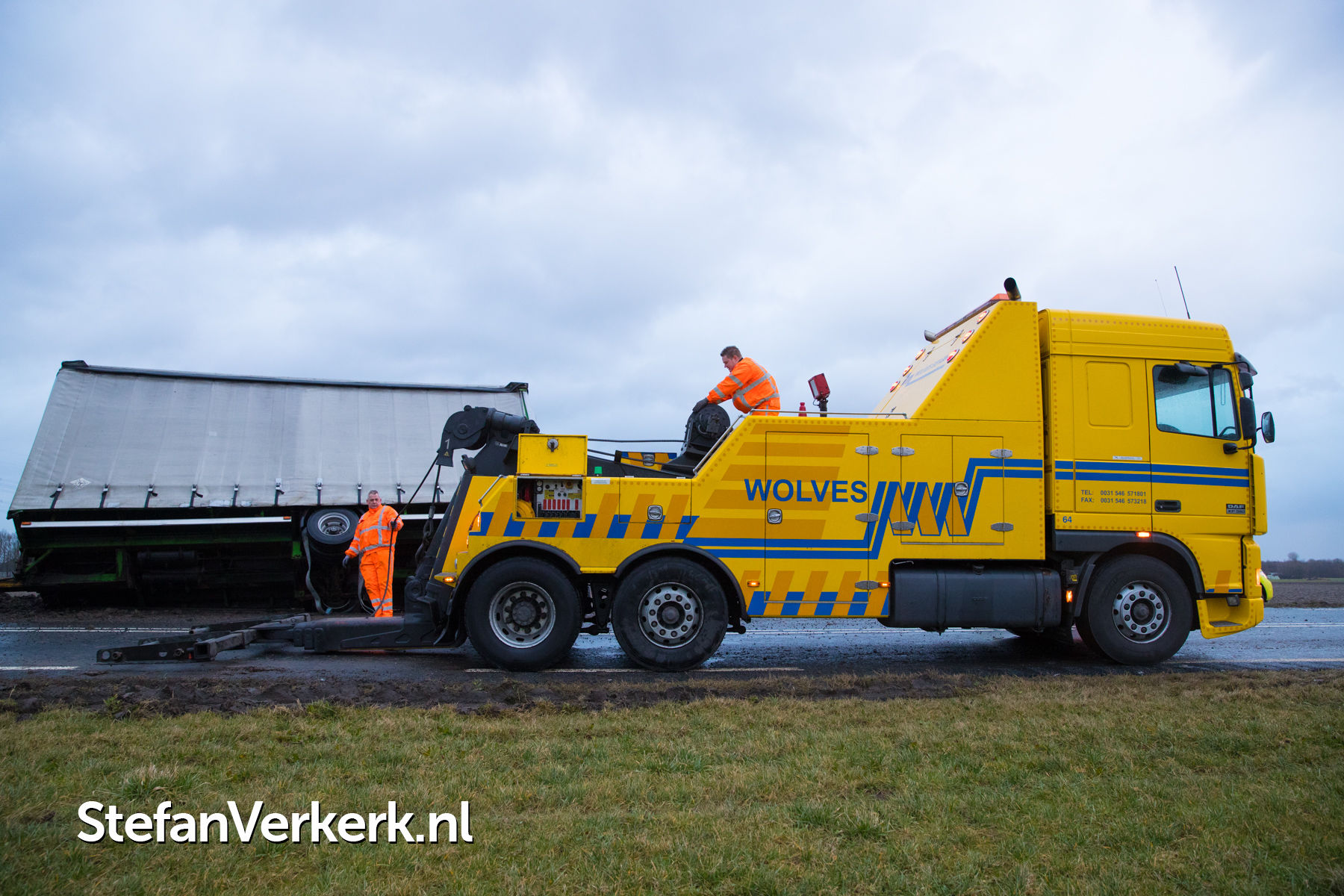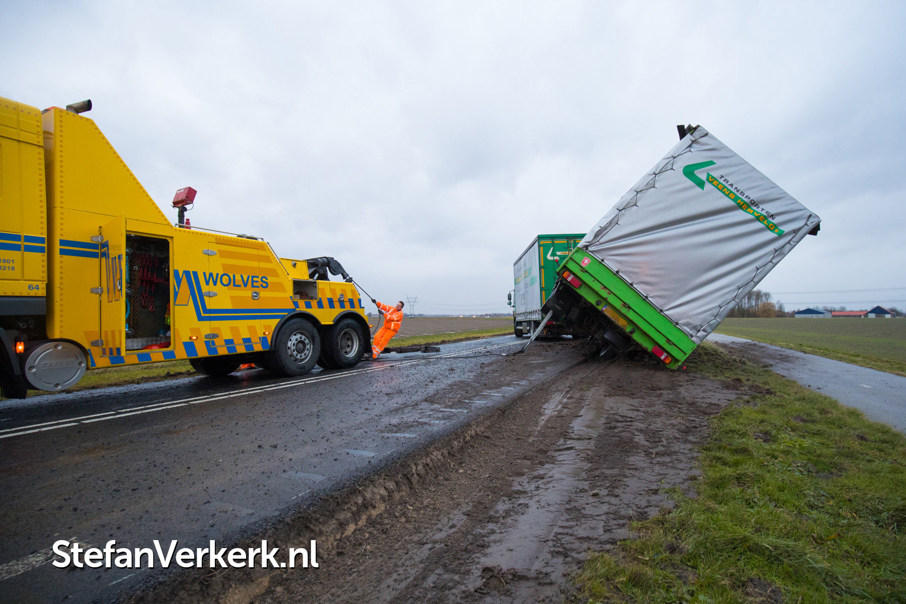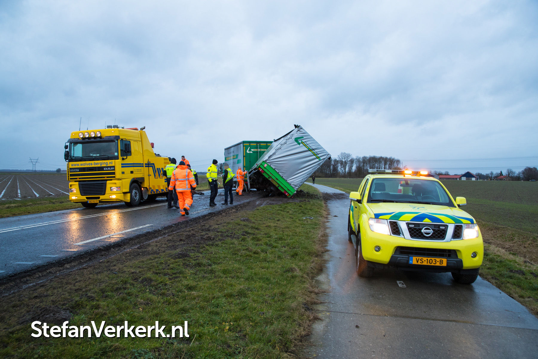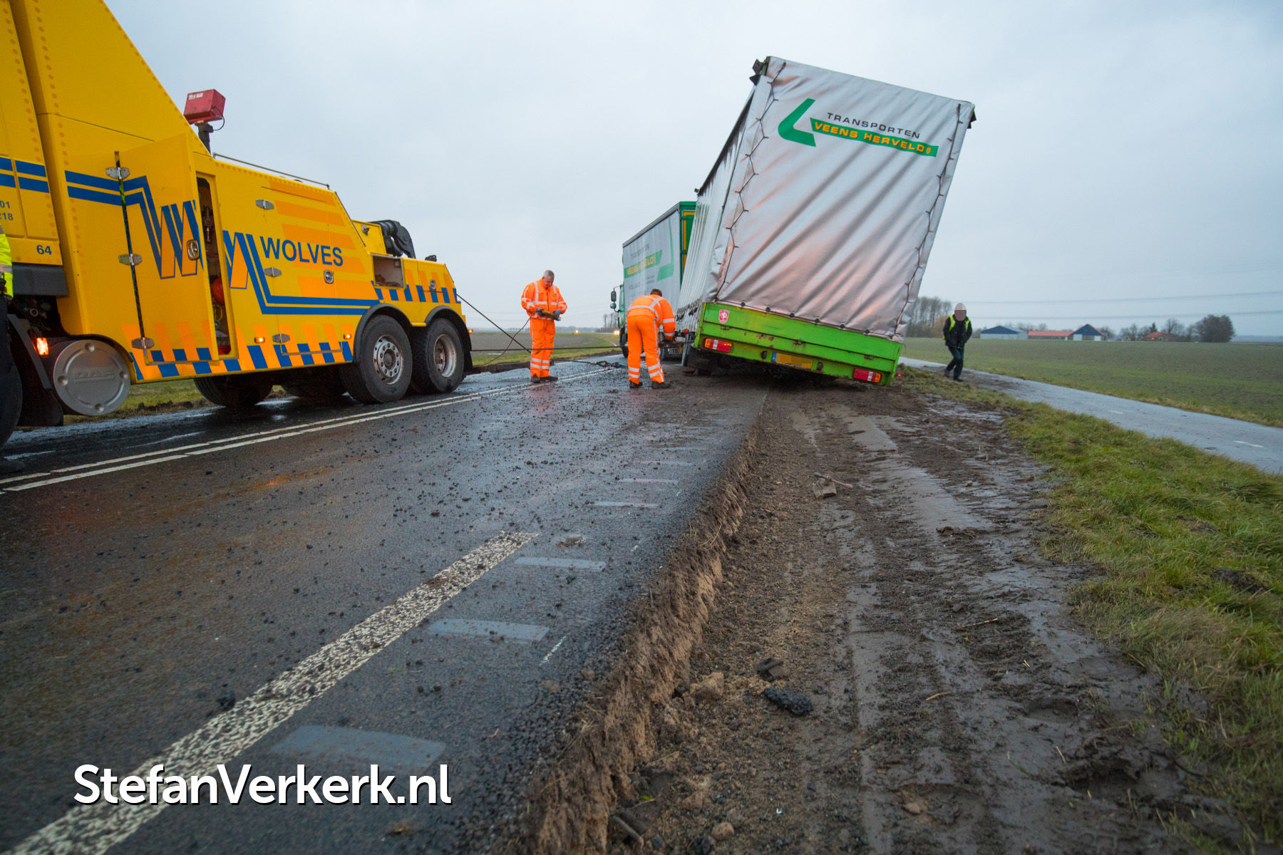 Foto's: Aanhanger vrachtwagen gekanteld door harde wind Elburgerweg N309 Dronten