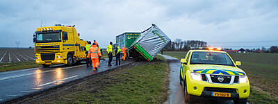 Aanhanger vrachtwagen gekanteld door harde wind Elburgerweg N309 Dronten