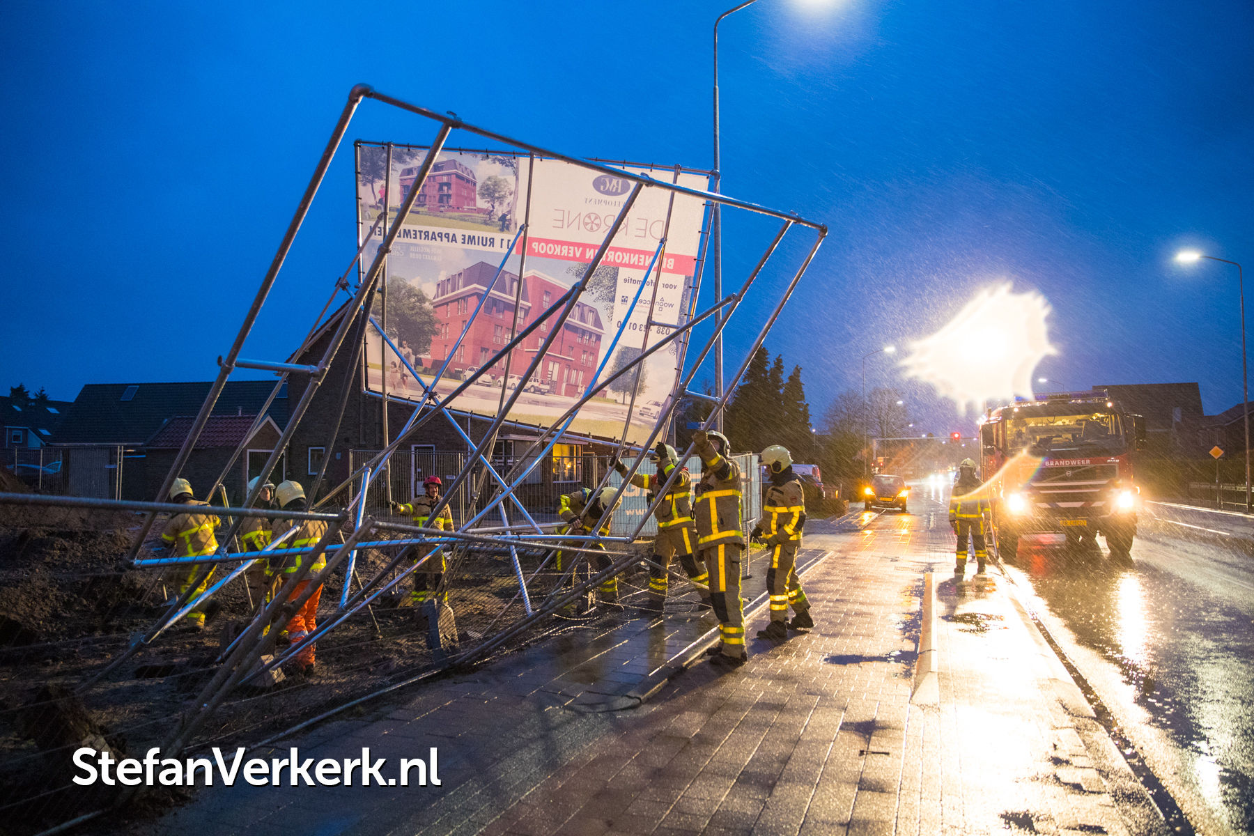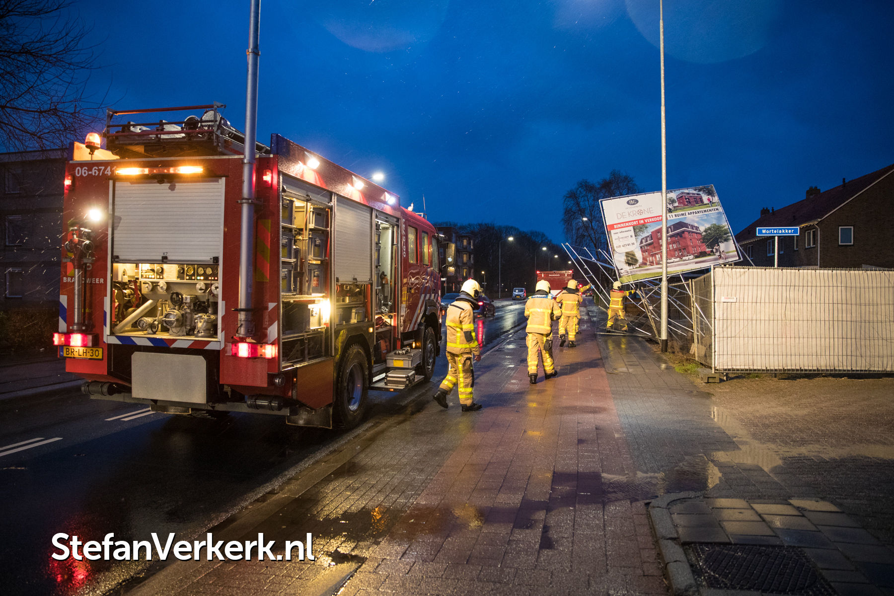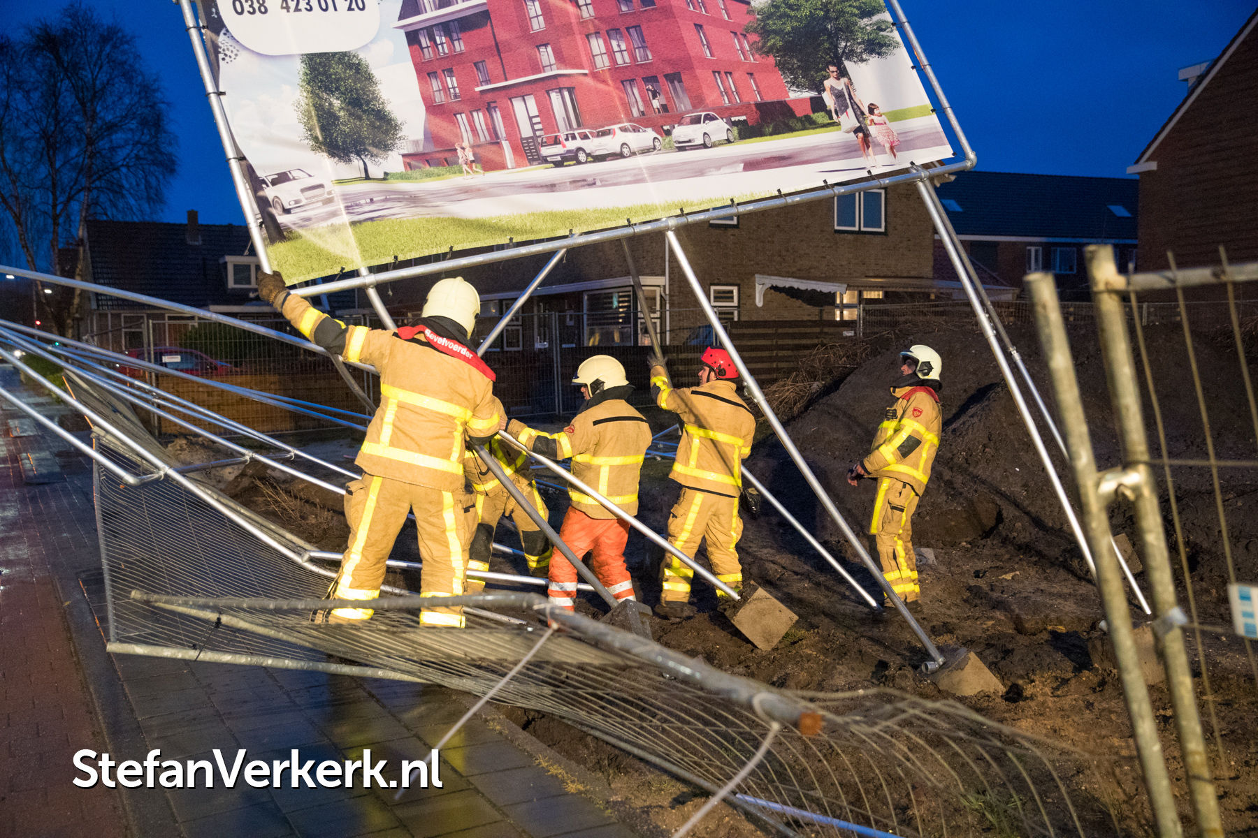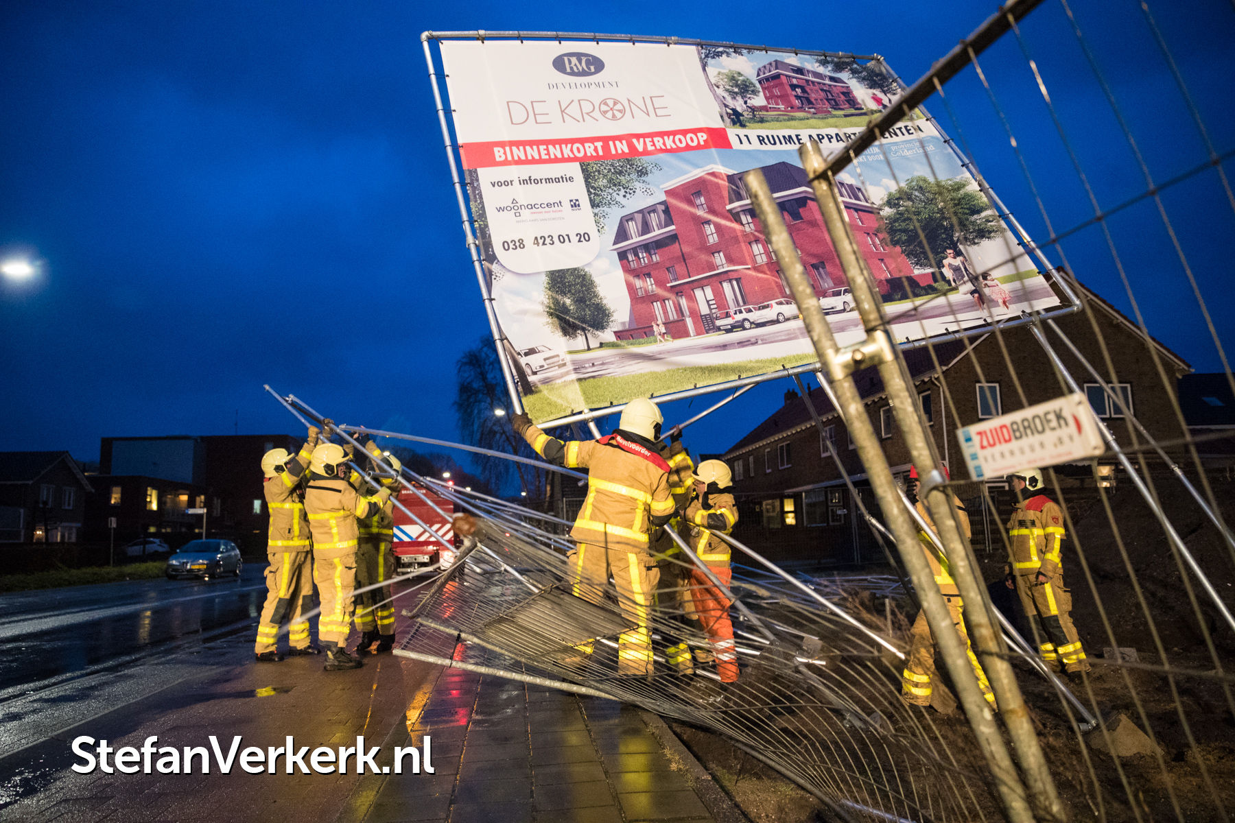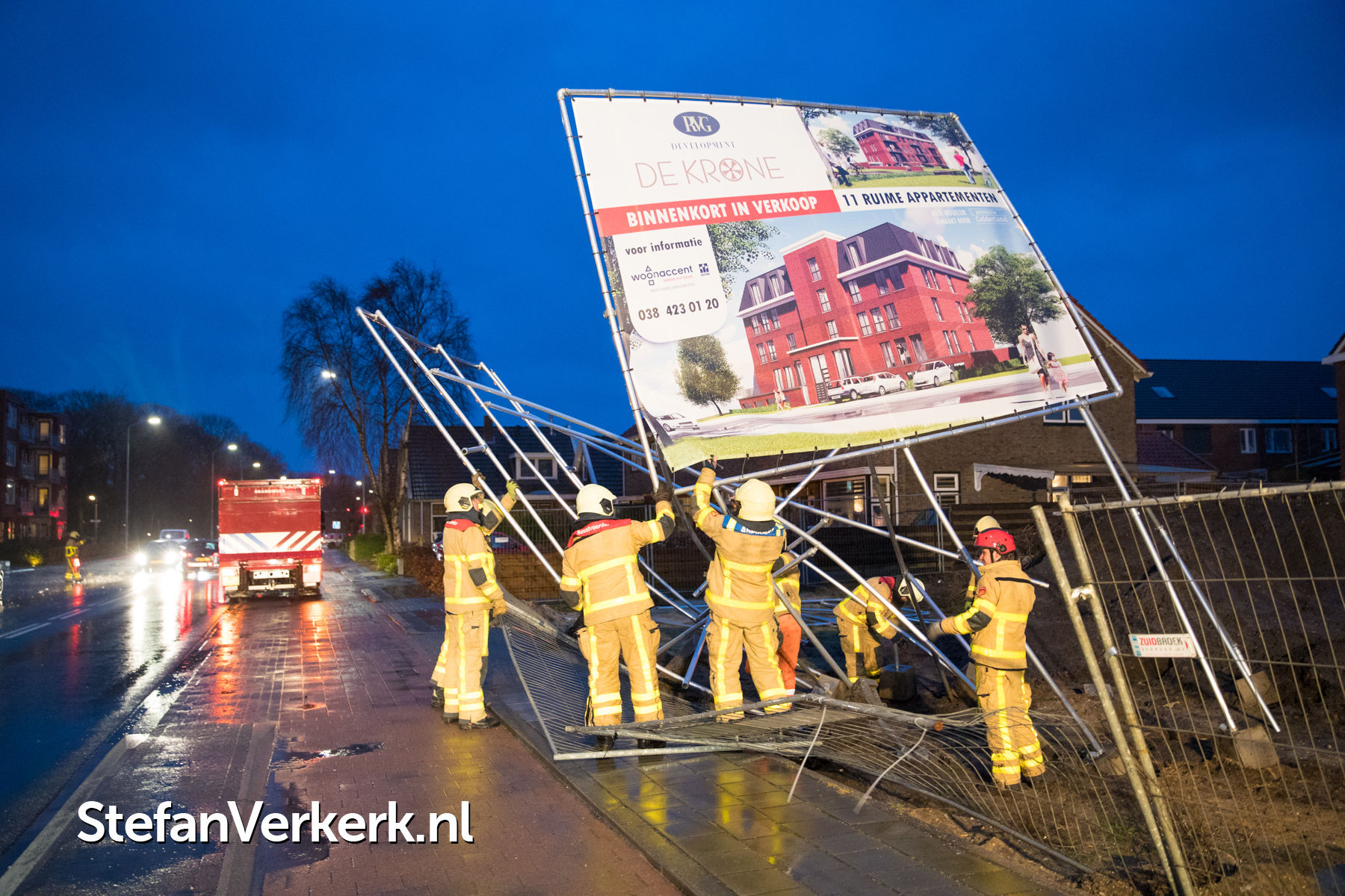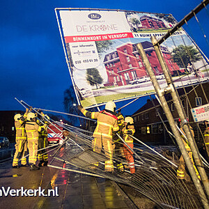 Foto's: Bouwbord op omvallen door harde windstoten Stationsweg Wezep