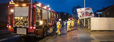Bouwbord op omvallen door harde windstoten Stationsweg Wezep