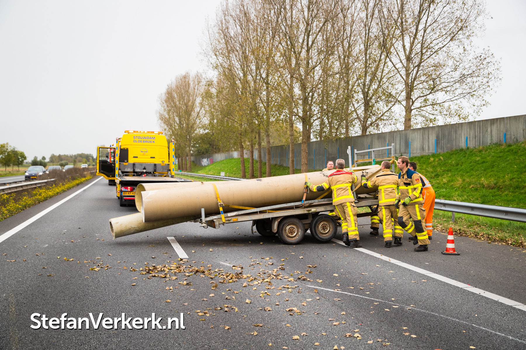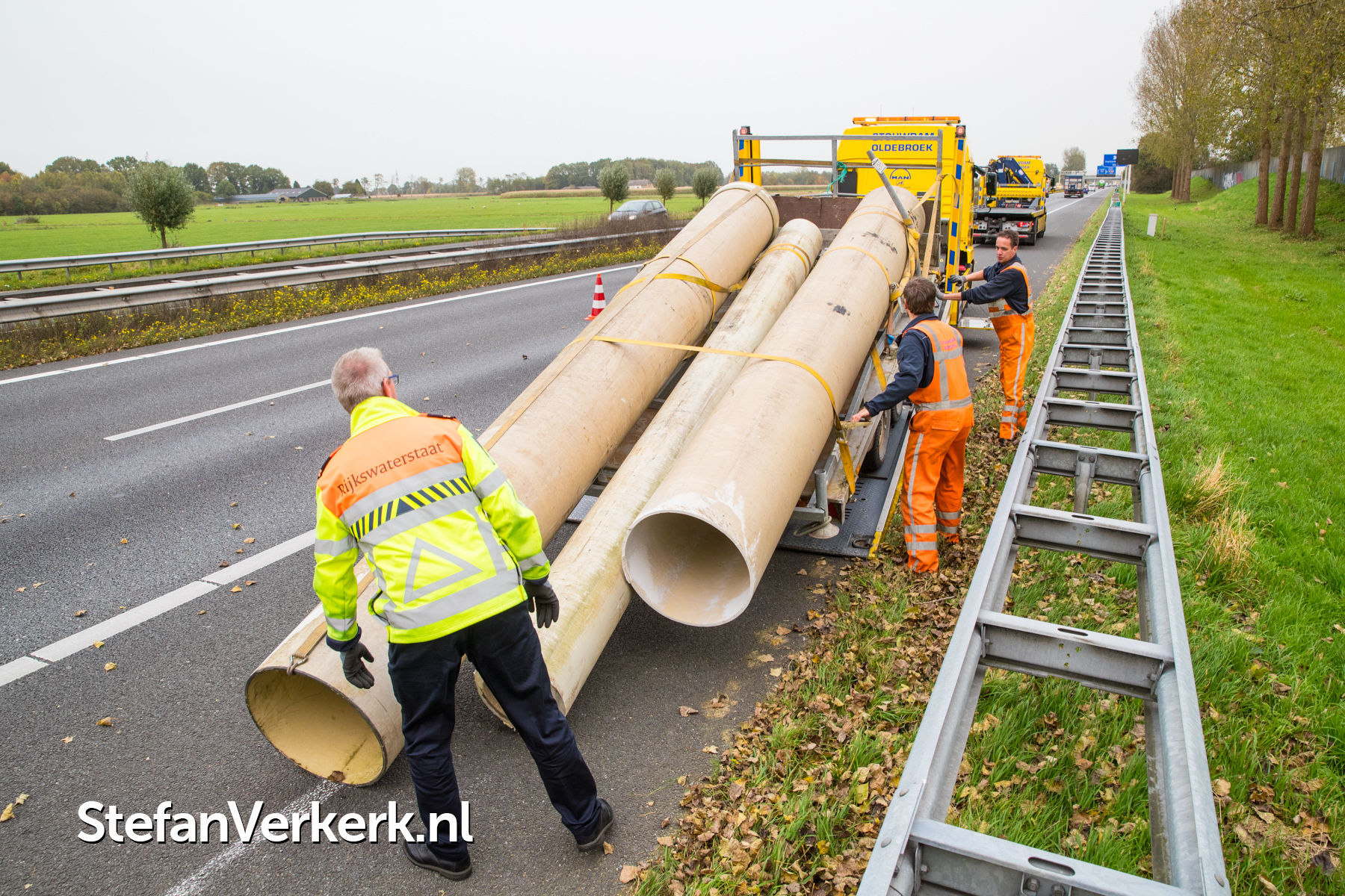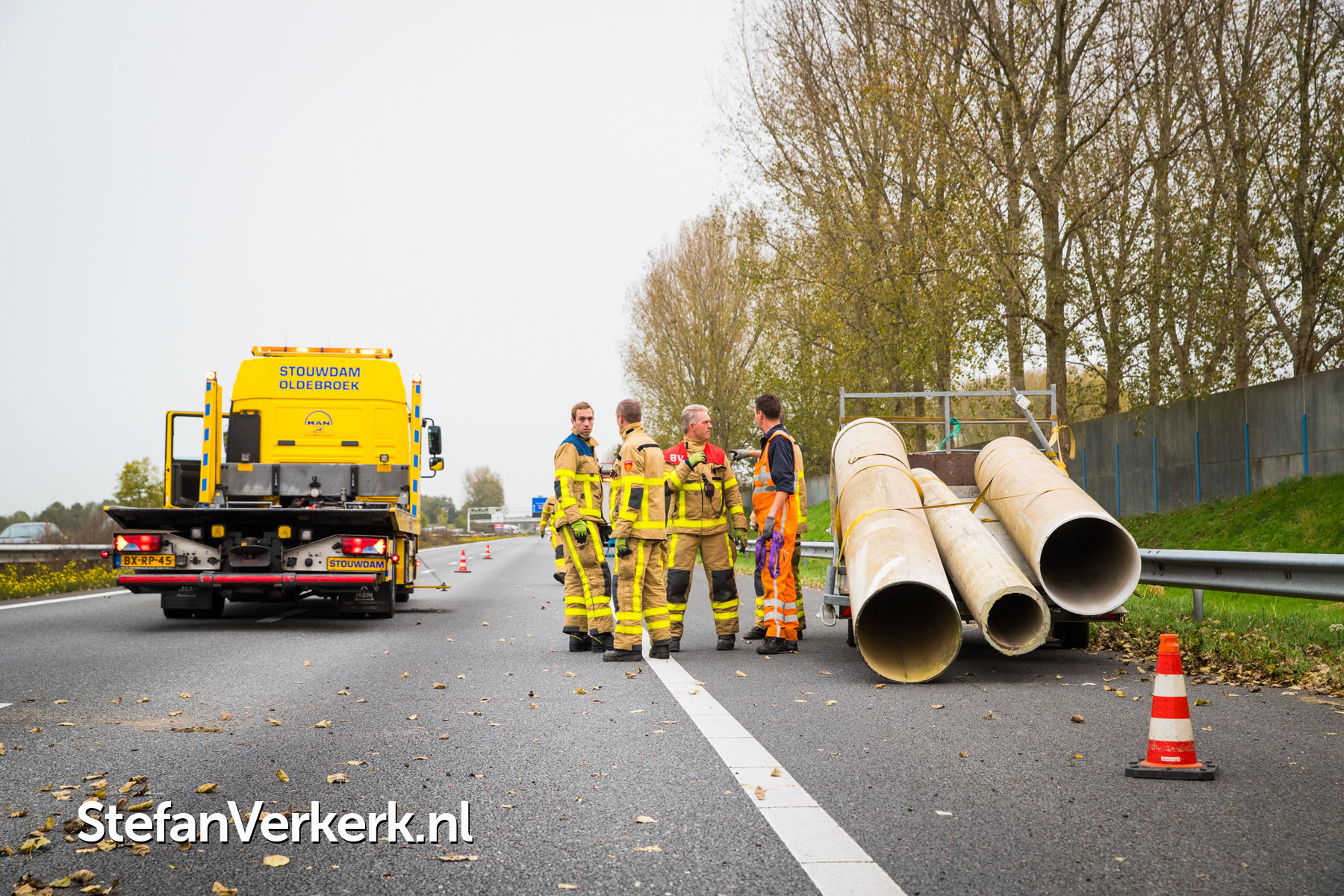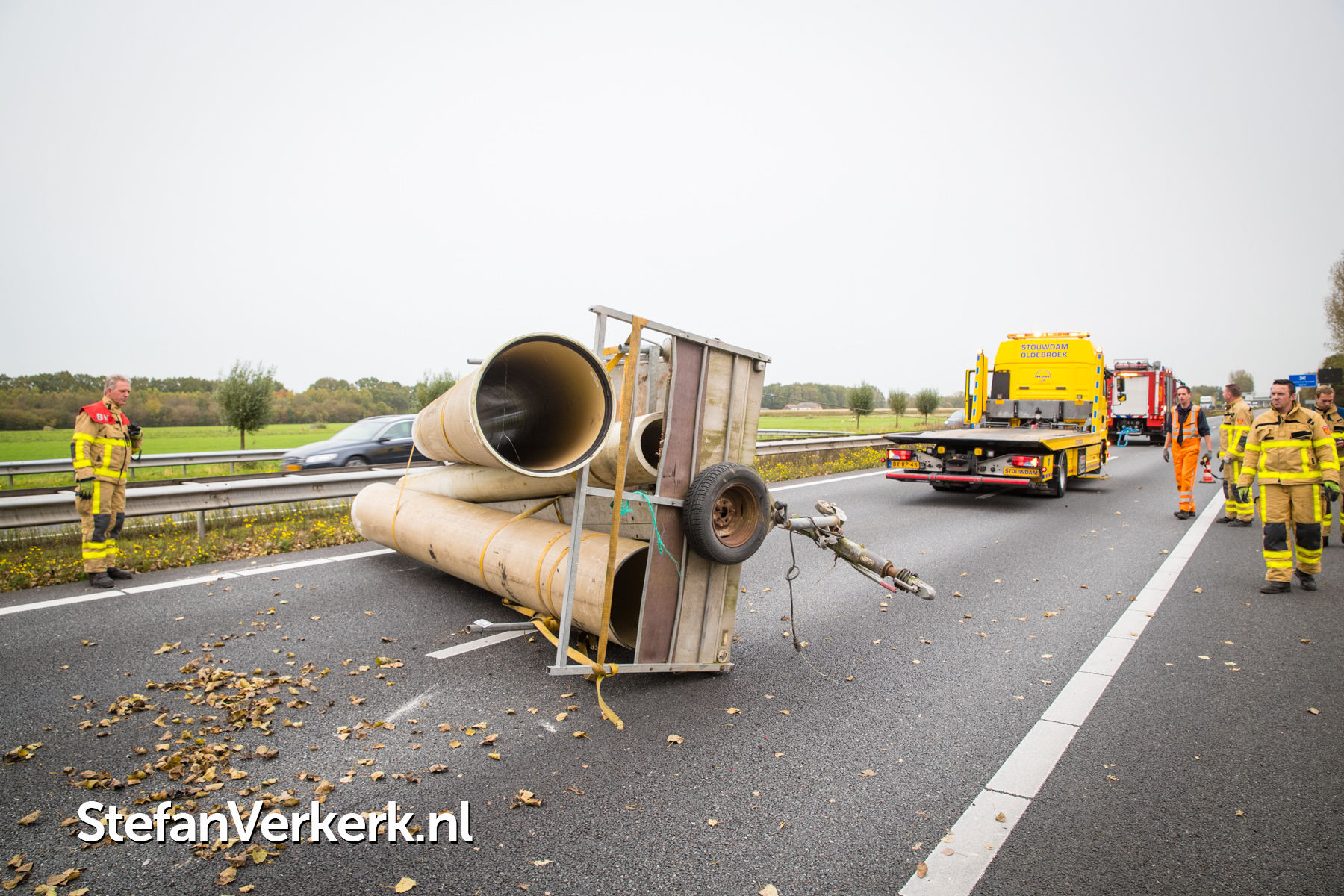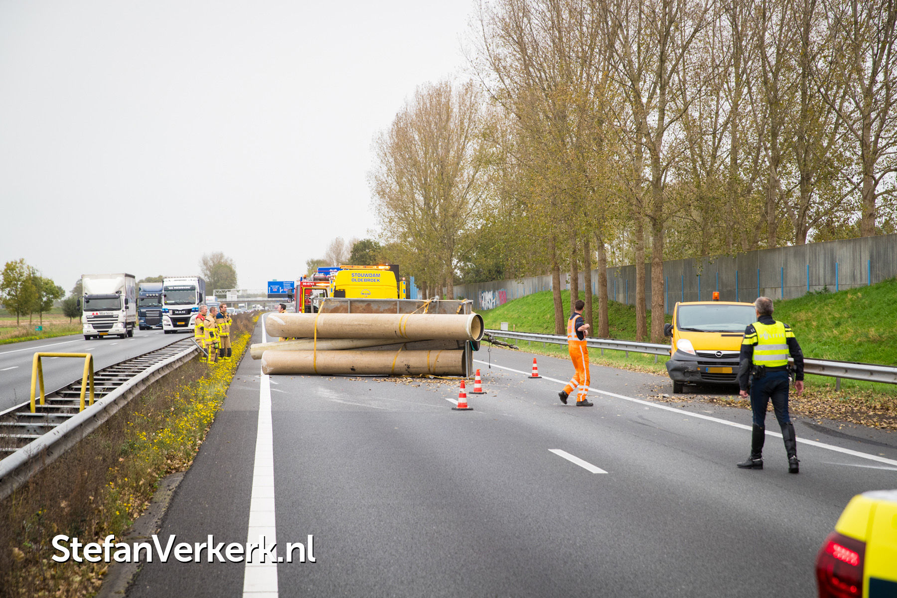 Foto's: Ongeval aanhanger met buizen geschaard A28 R 82,8 Wezep