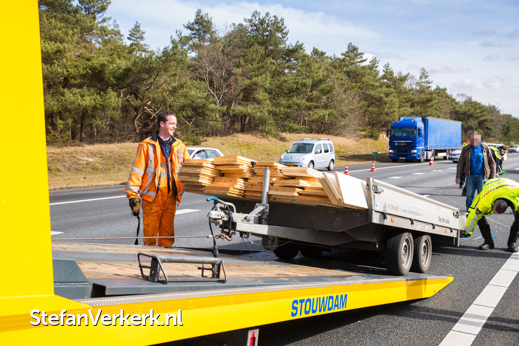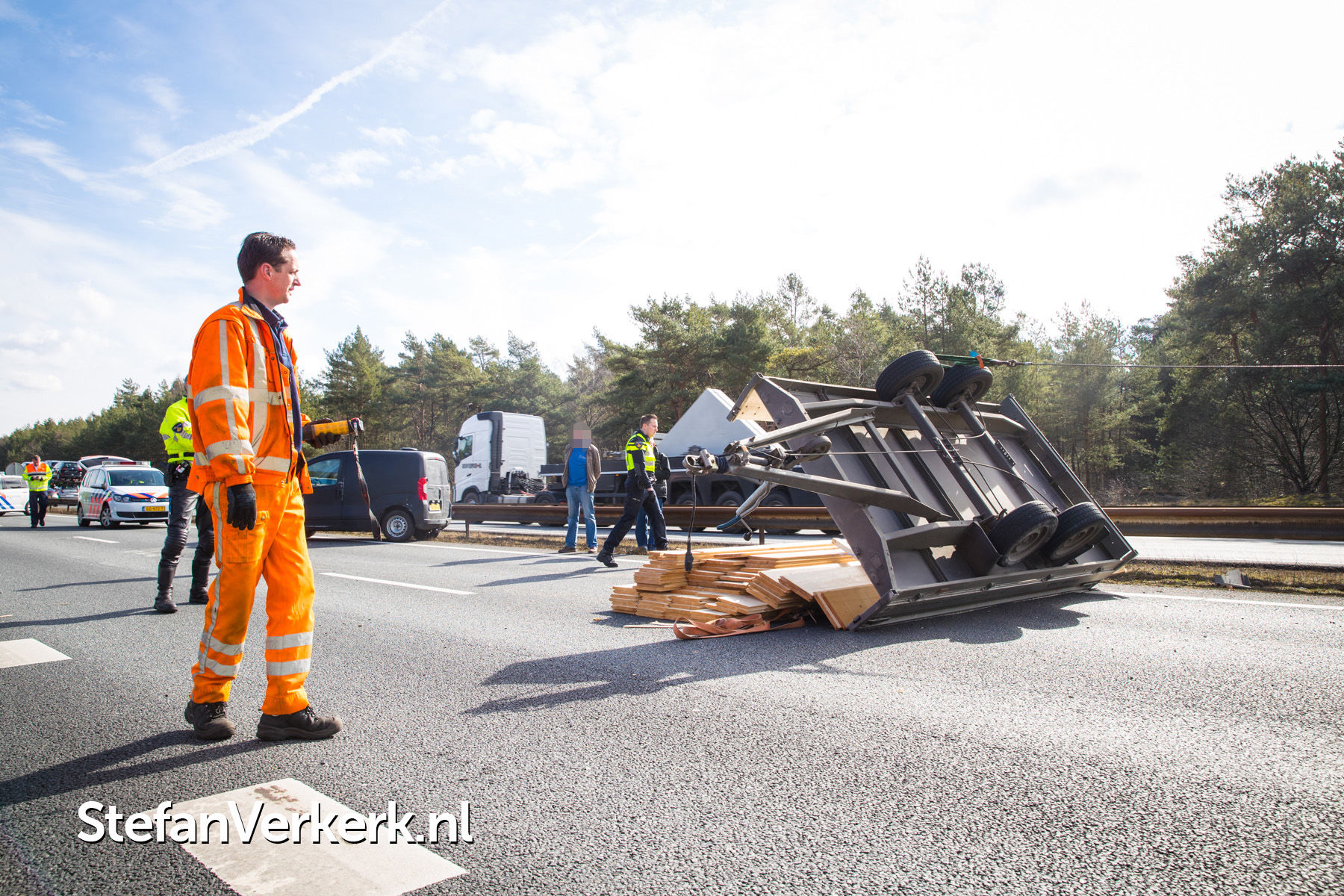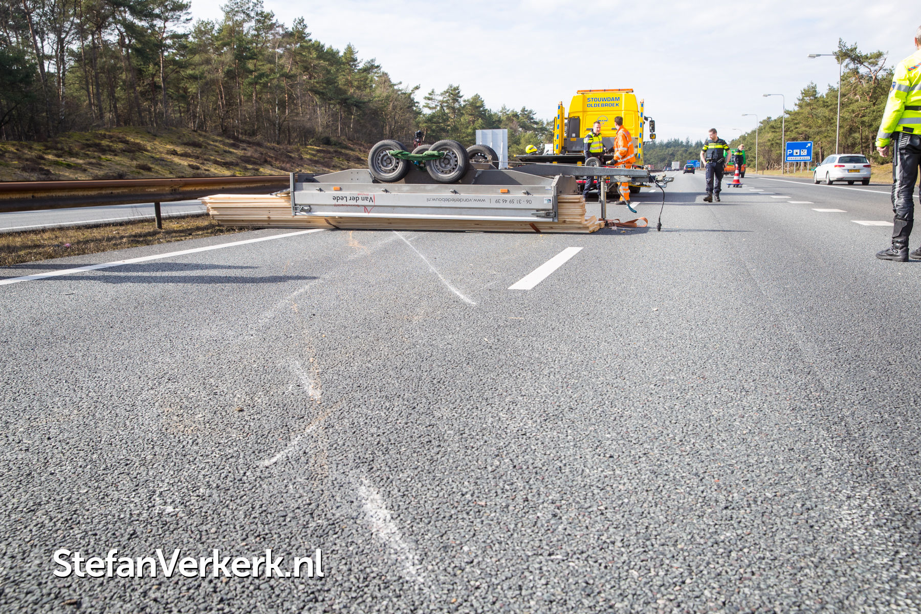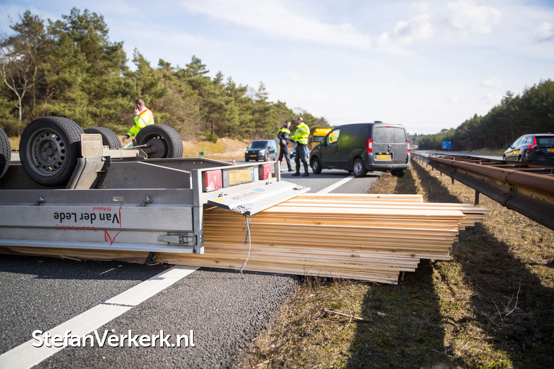 Foto's: Ongeval aanhanger met planken gekanteld A28 L 62,7 Nunspeet
