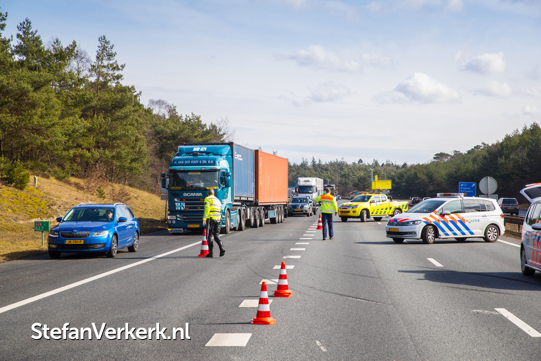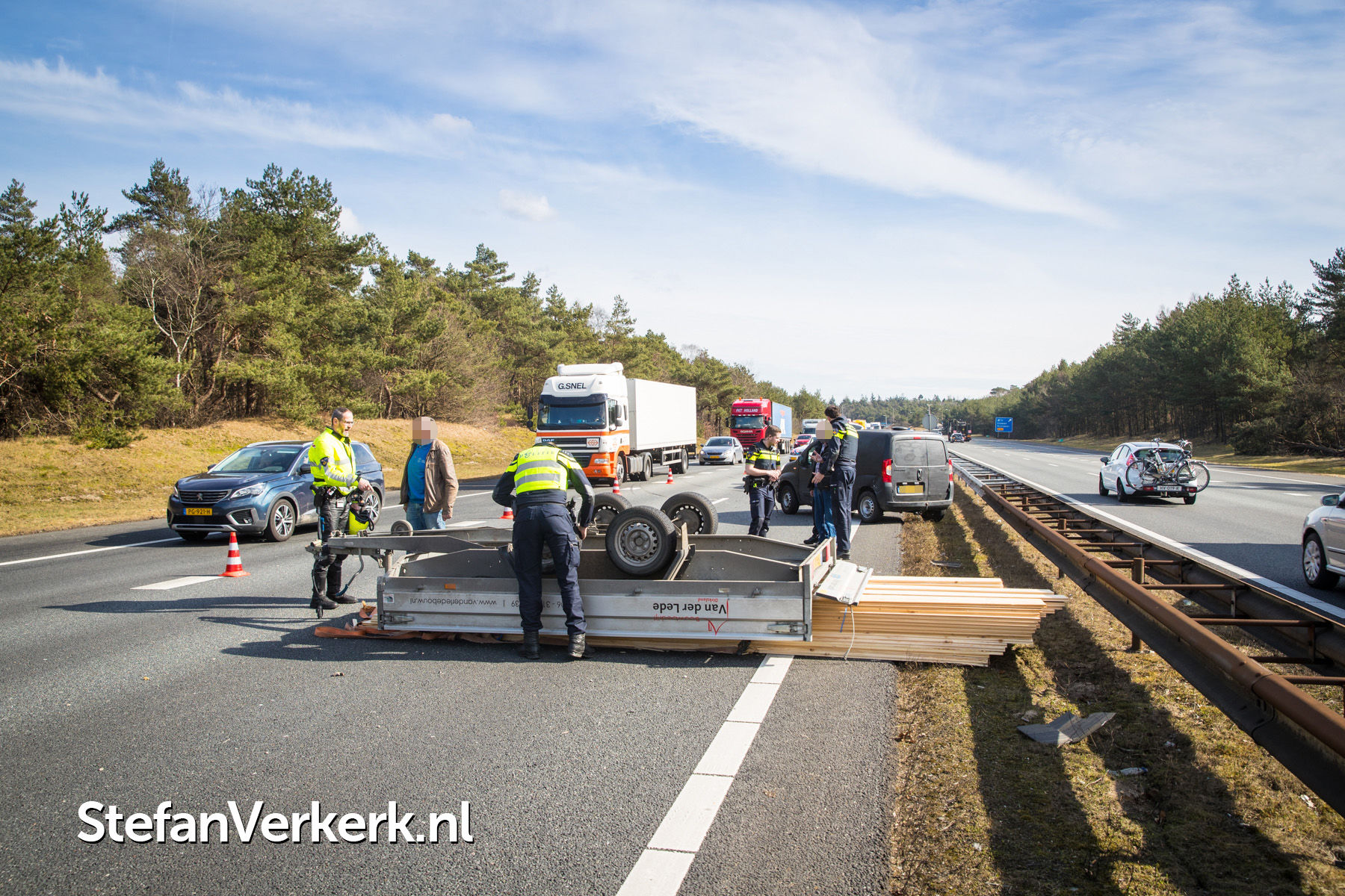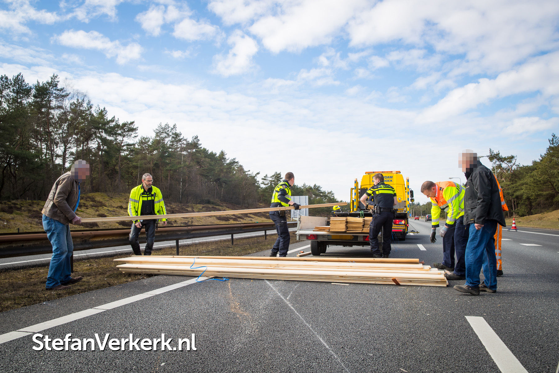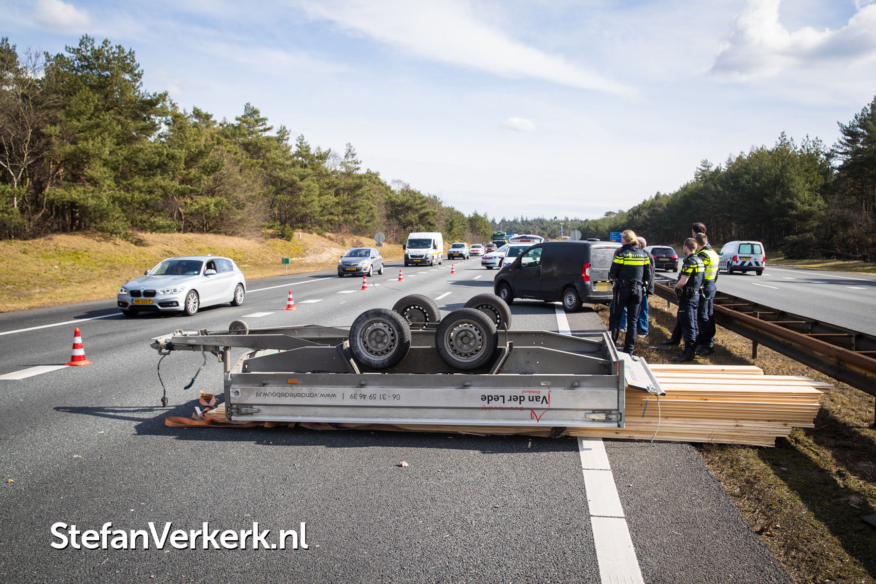 Foto's: Ongeval aanhanger met planken gekanteld A28 L 62,7 Nunspeet