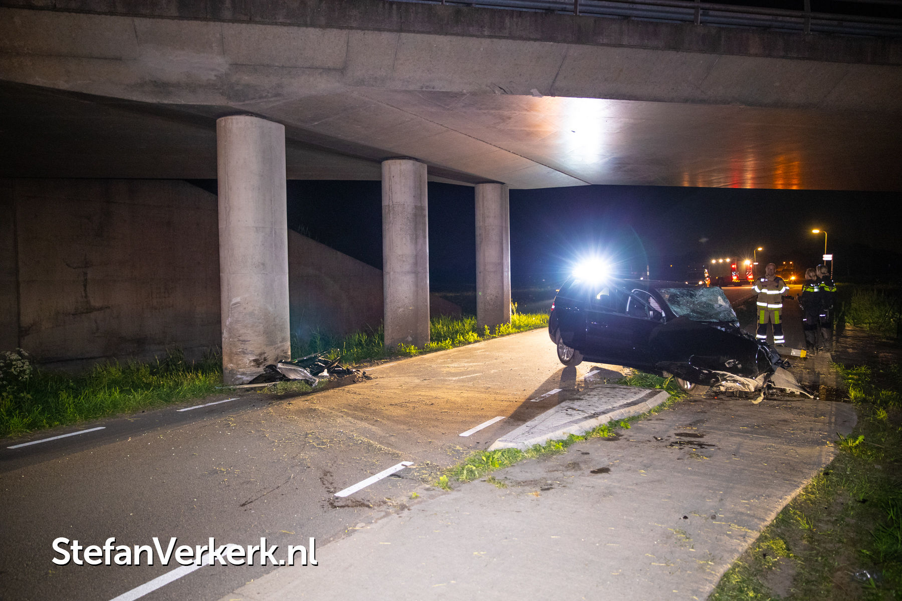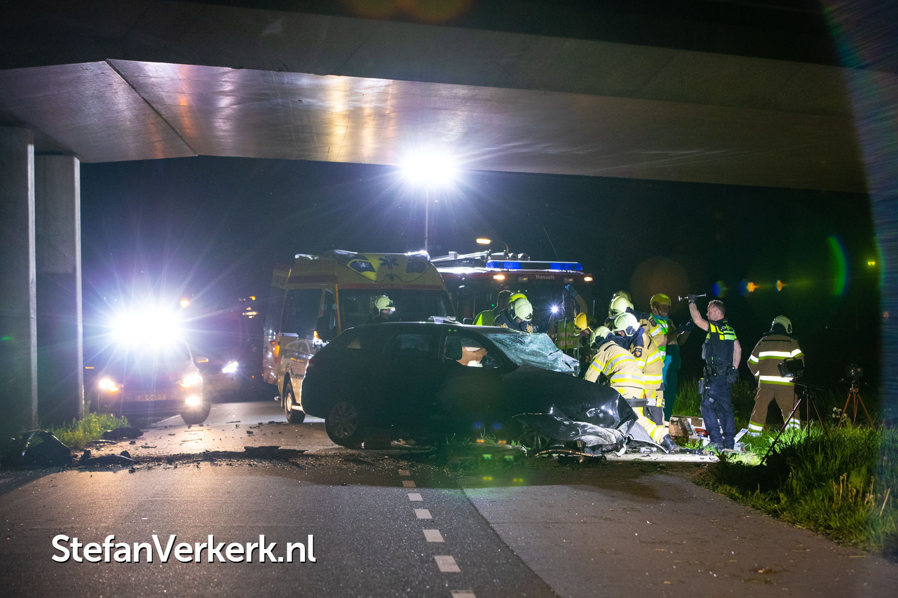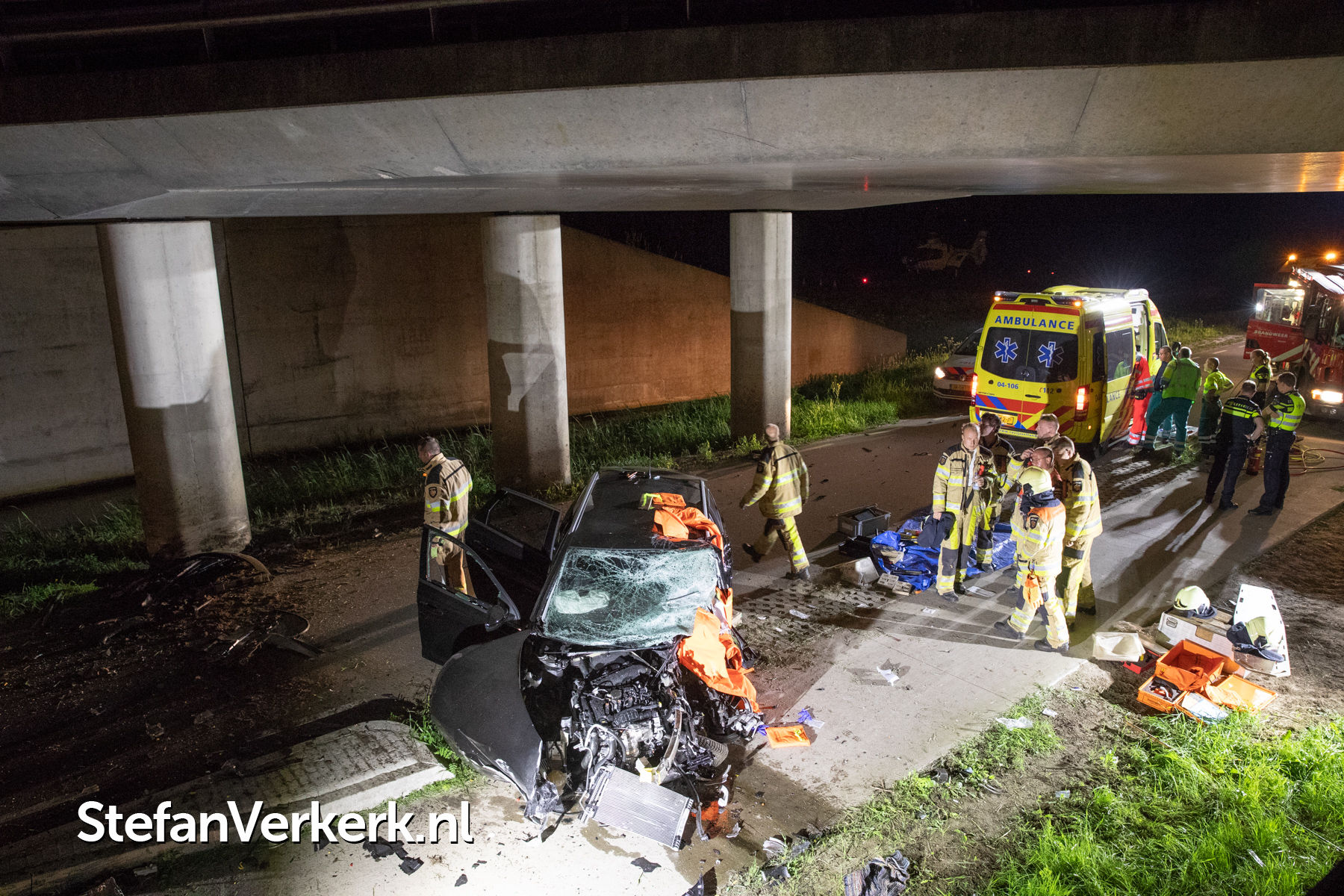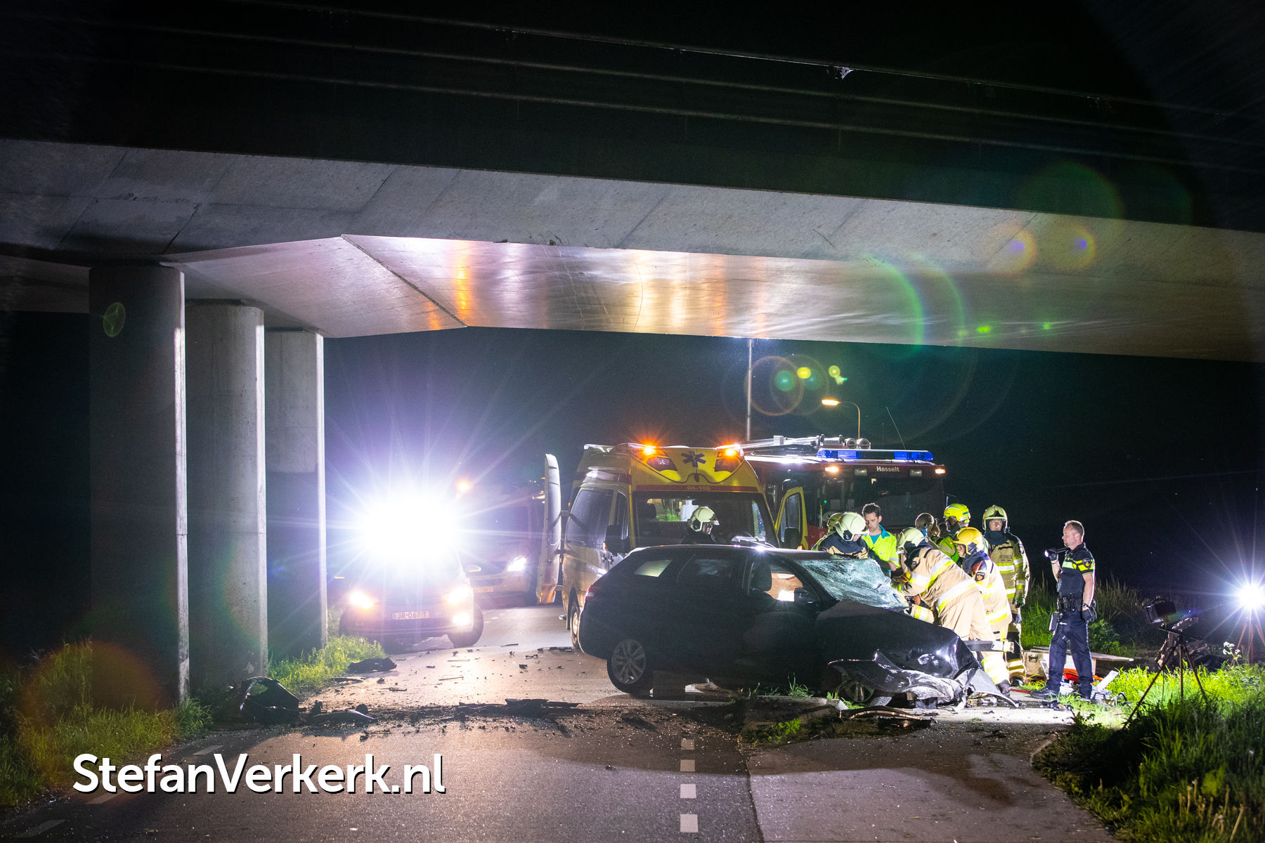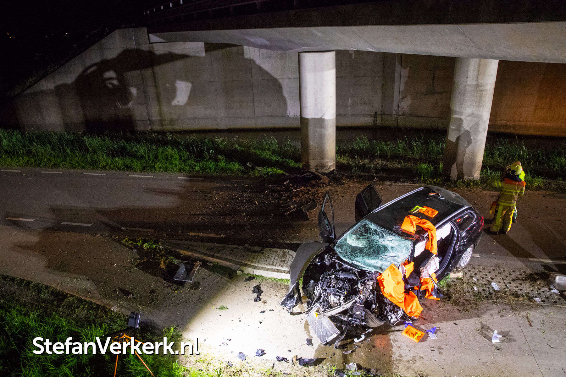 Foto's: Zwaar eenzijdig ongeval auto tegen pijler viaduct Ruimzichtweg Zwolle