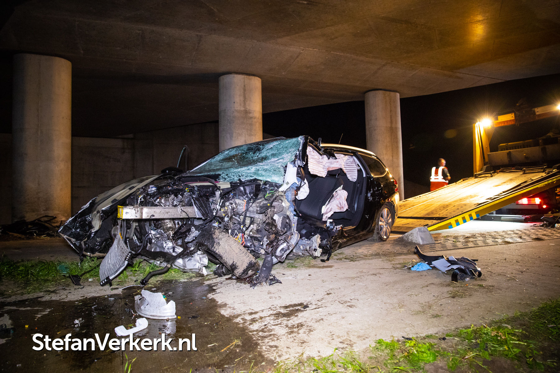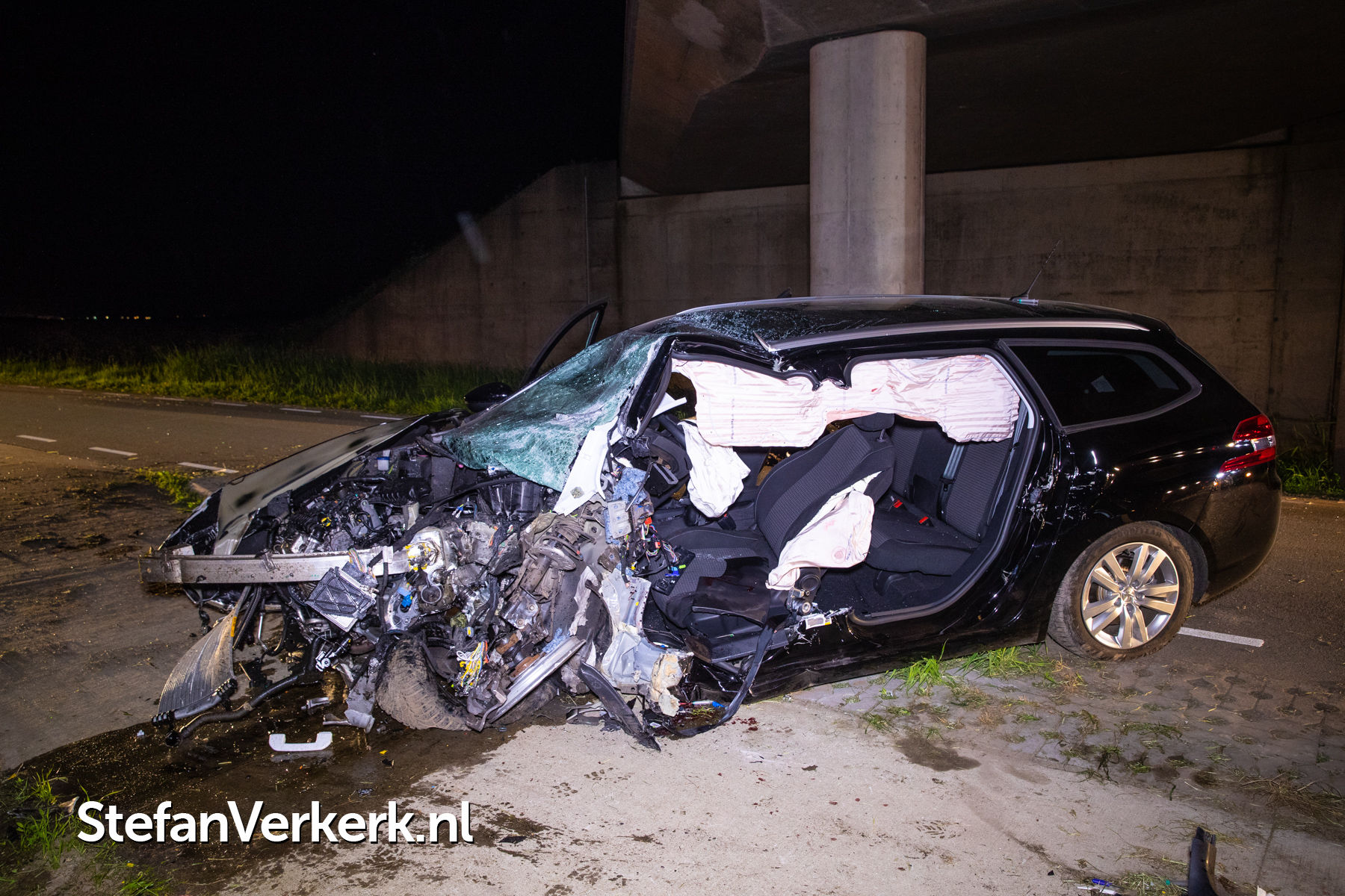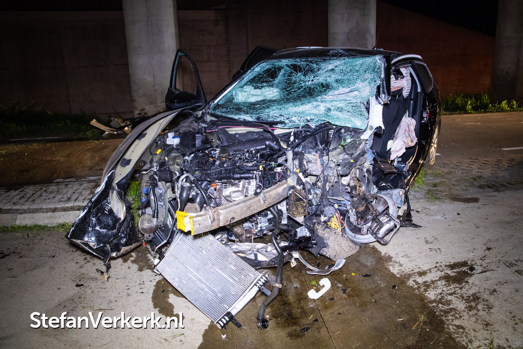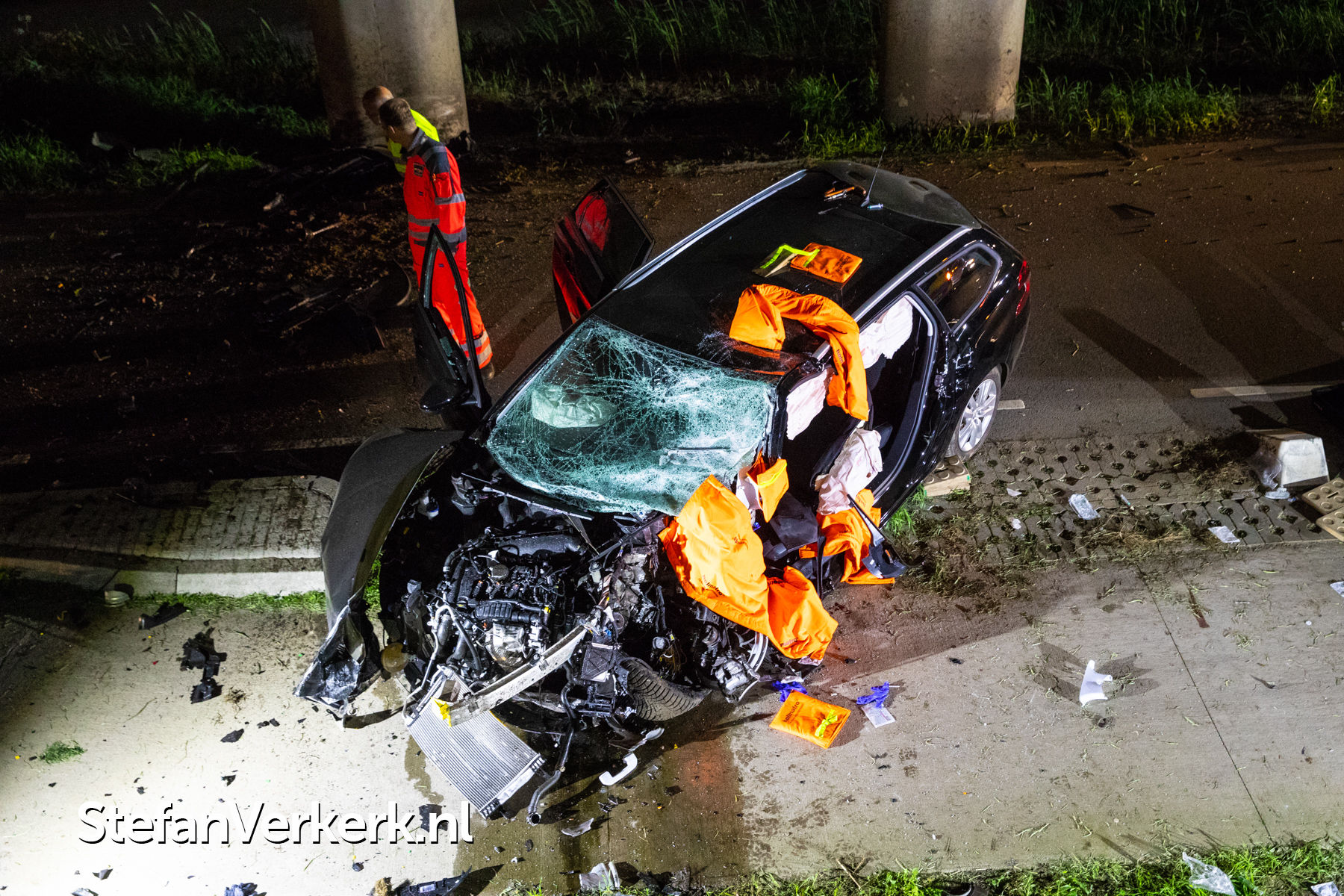 Foto's: Zwaar eenzijdig ongeval auto tegen pijler viaduct Ruimzichtweg Zwolle
