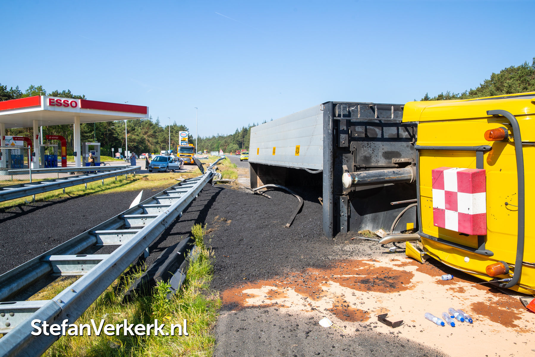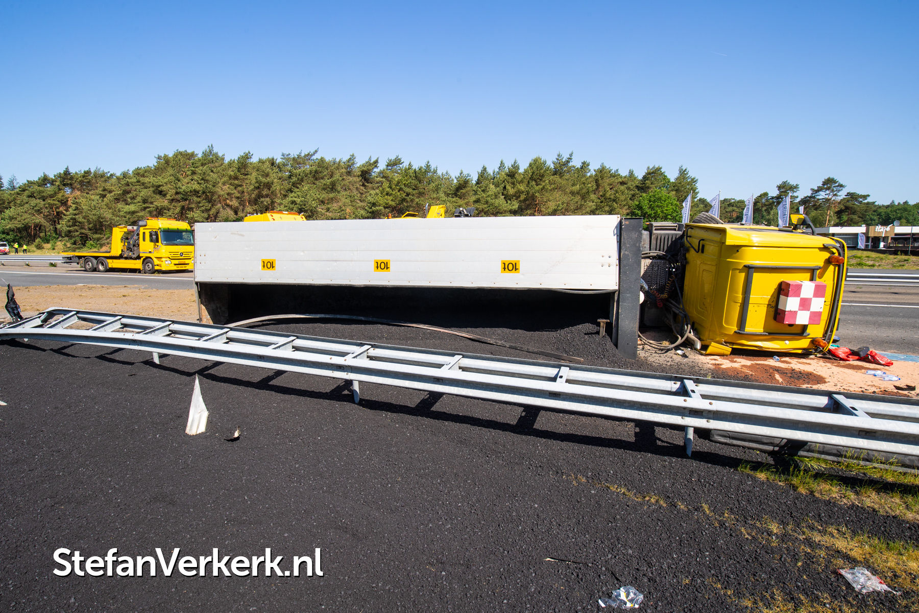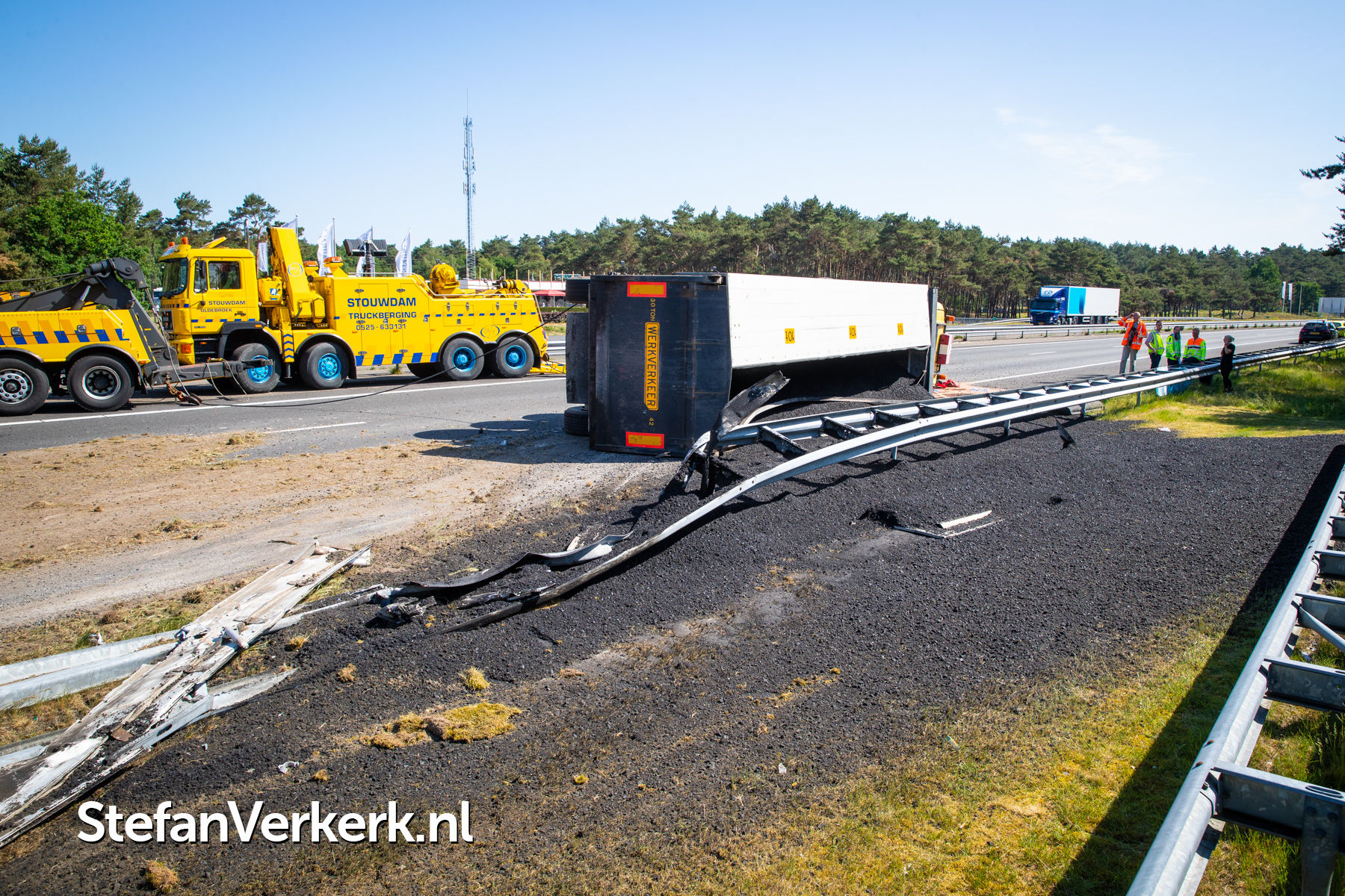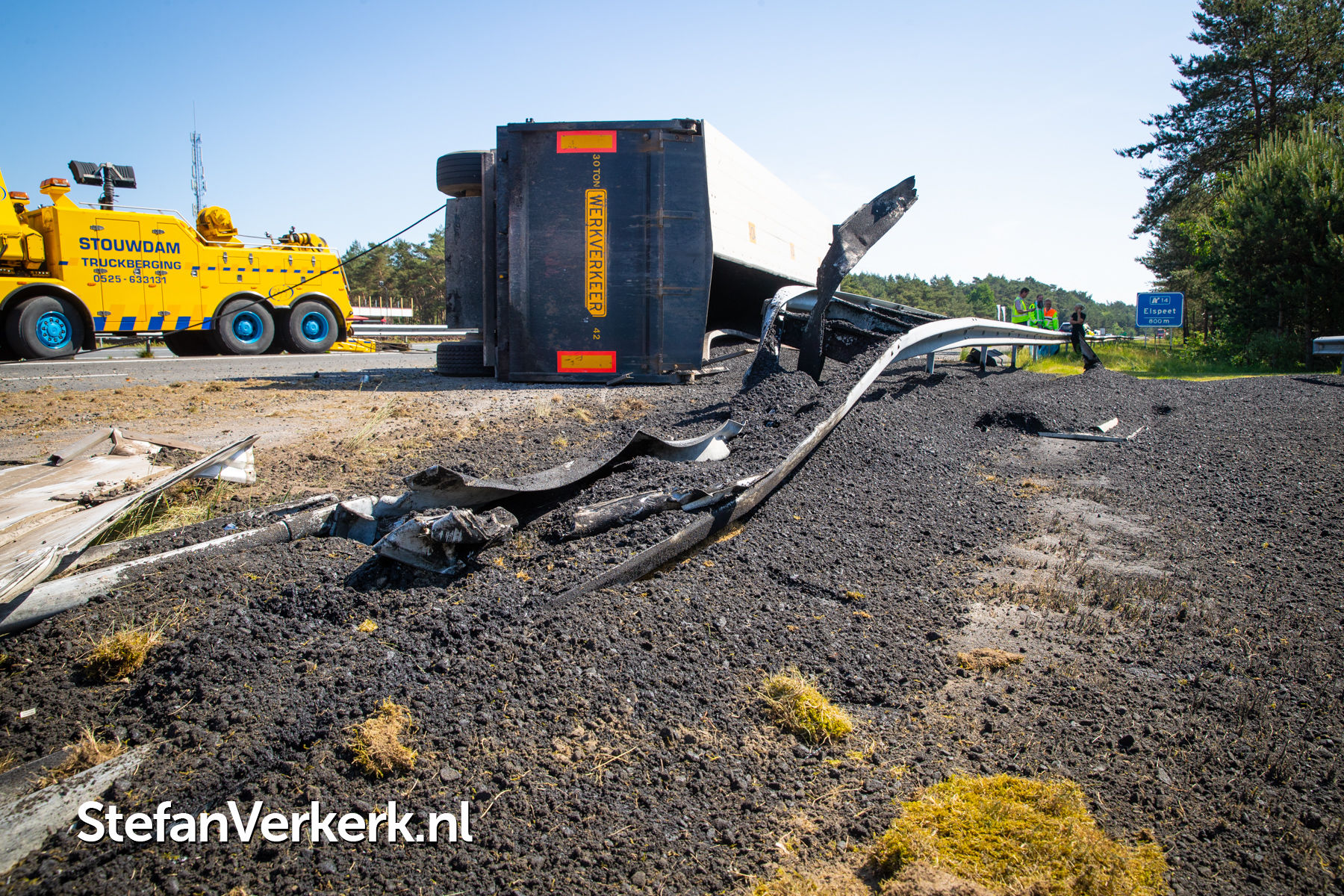 Foto's: Vrachtwagen met warm asfalt gekanteld A28 R 62,0 Nunspeet