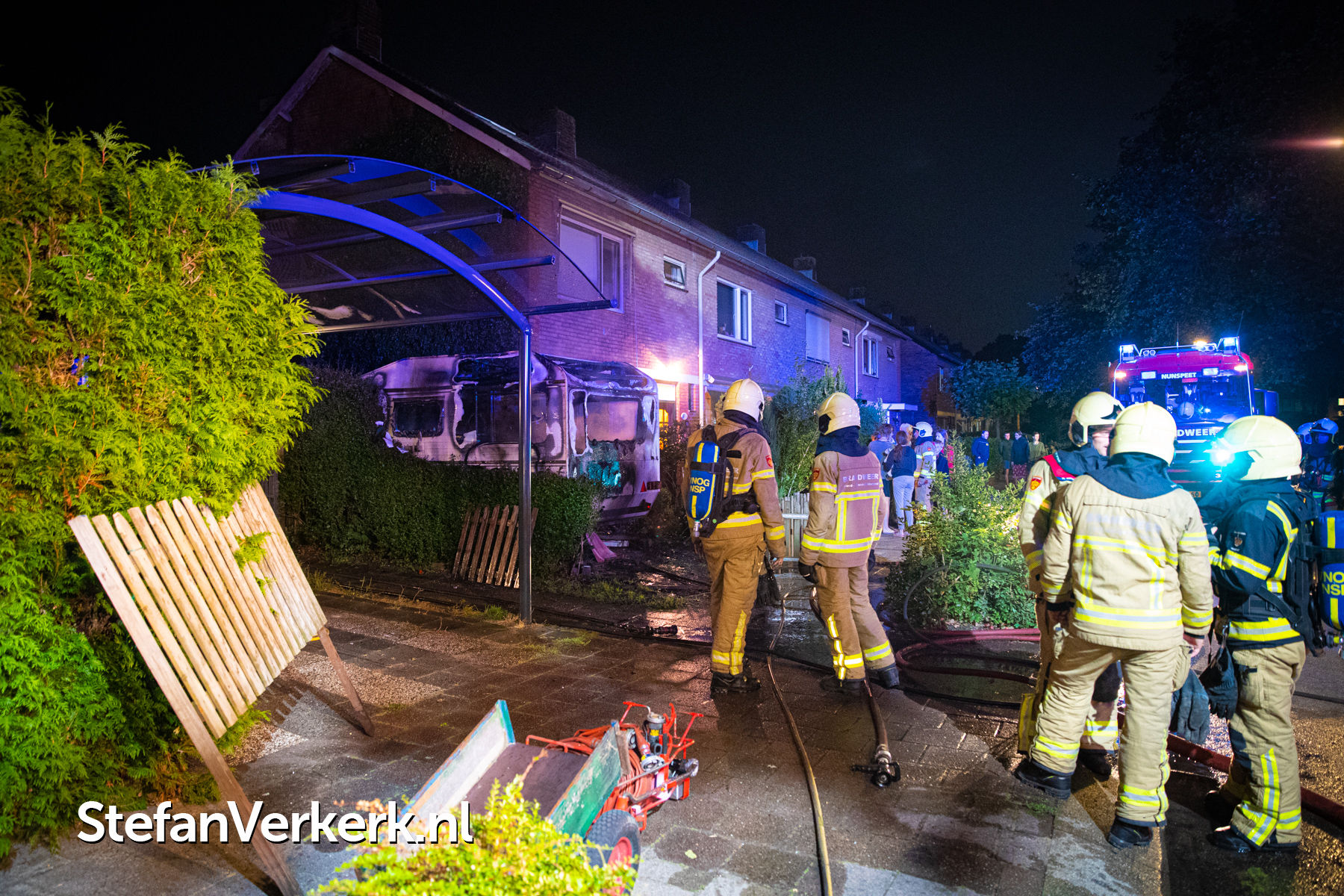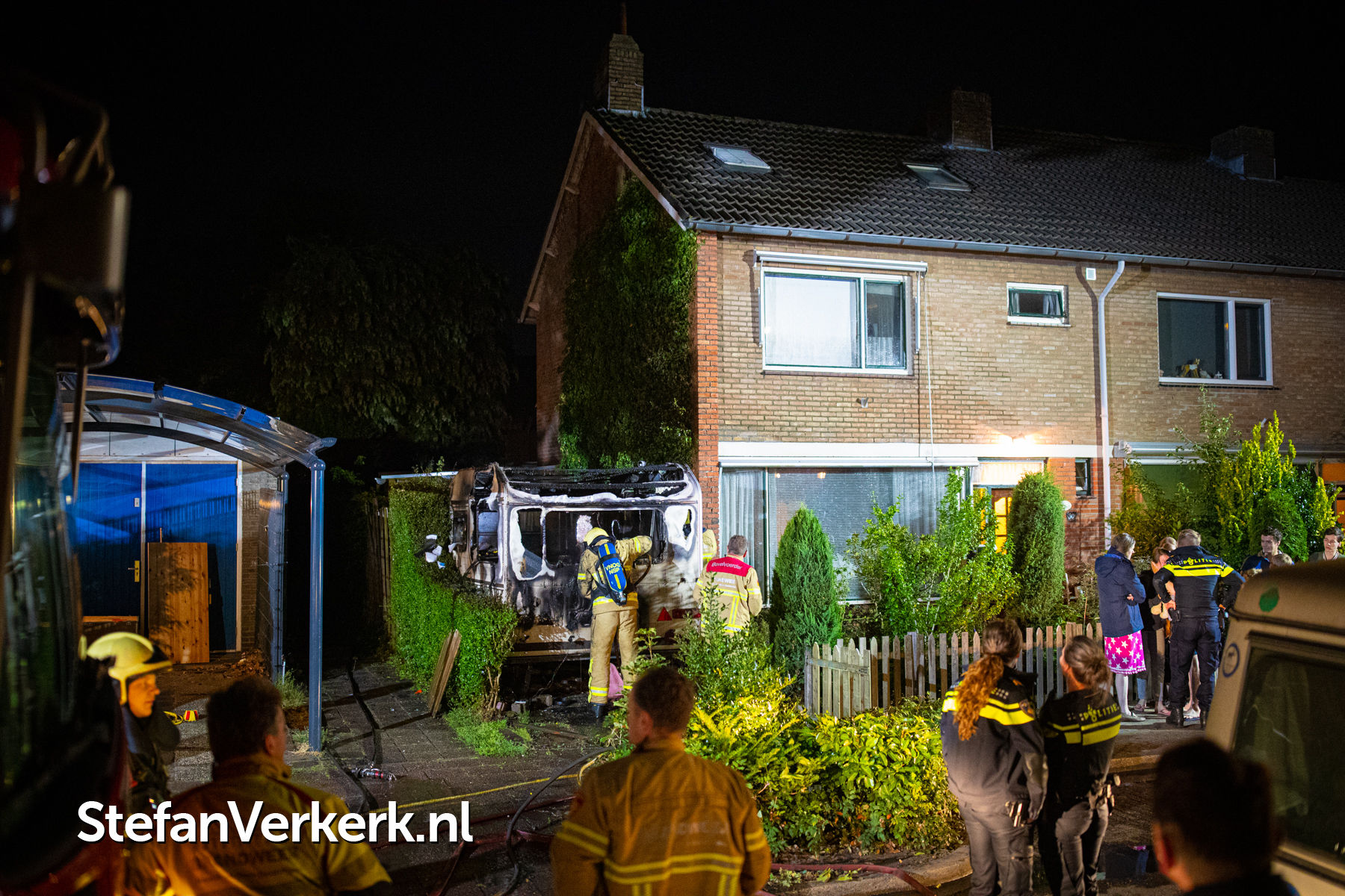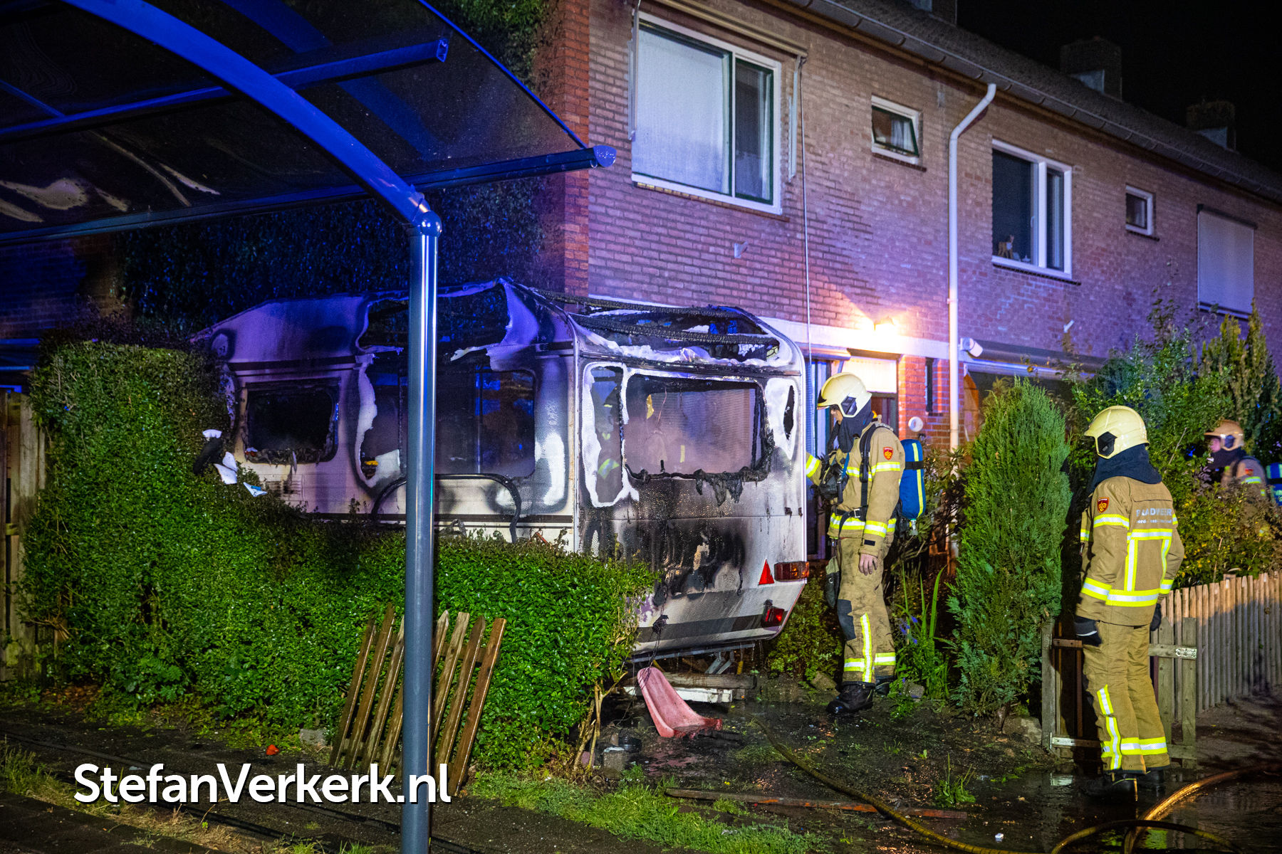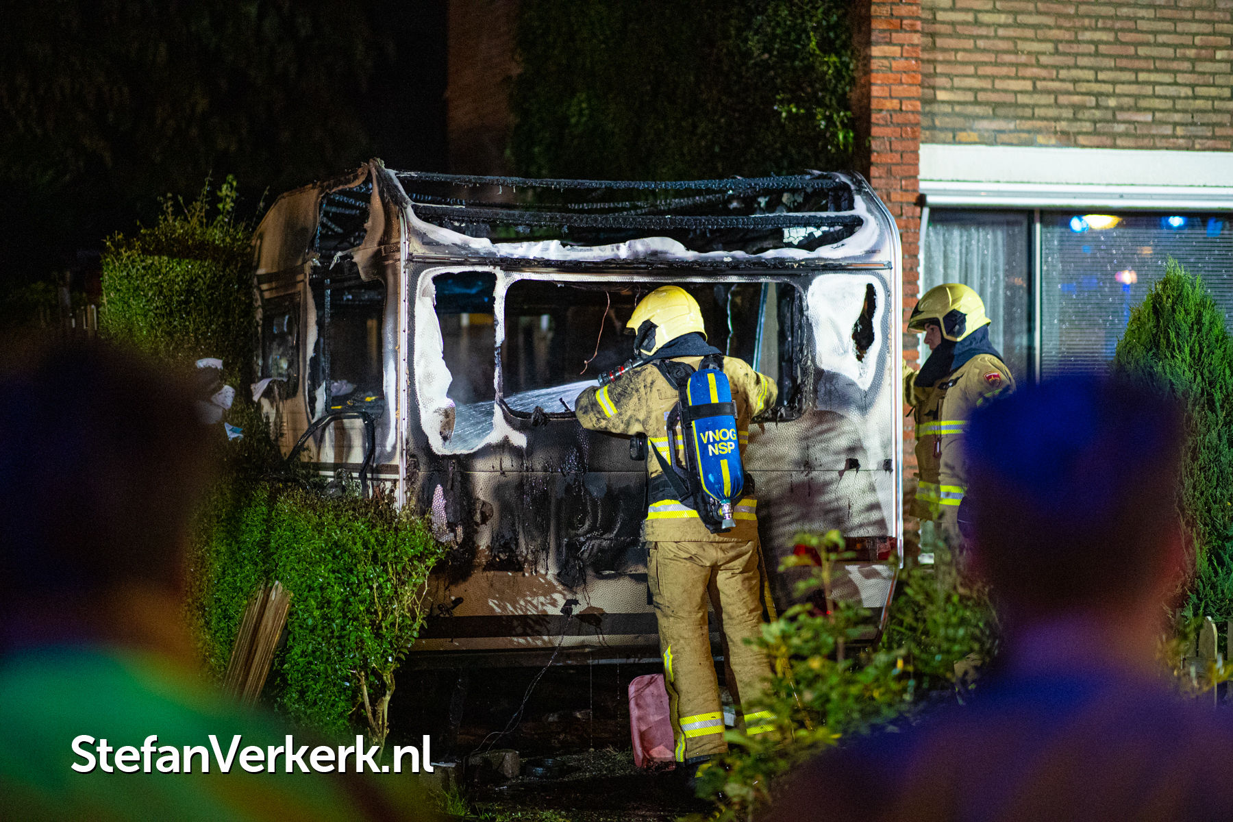 Foto's: Caravan in brand bij woning Dreeslaan Nunspeet