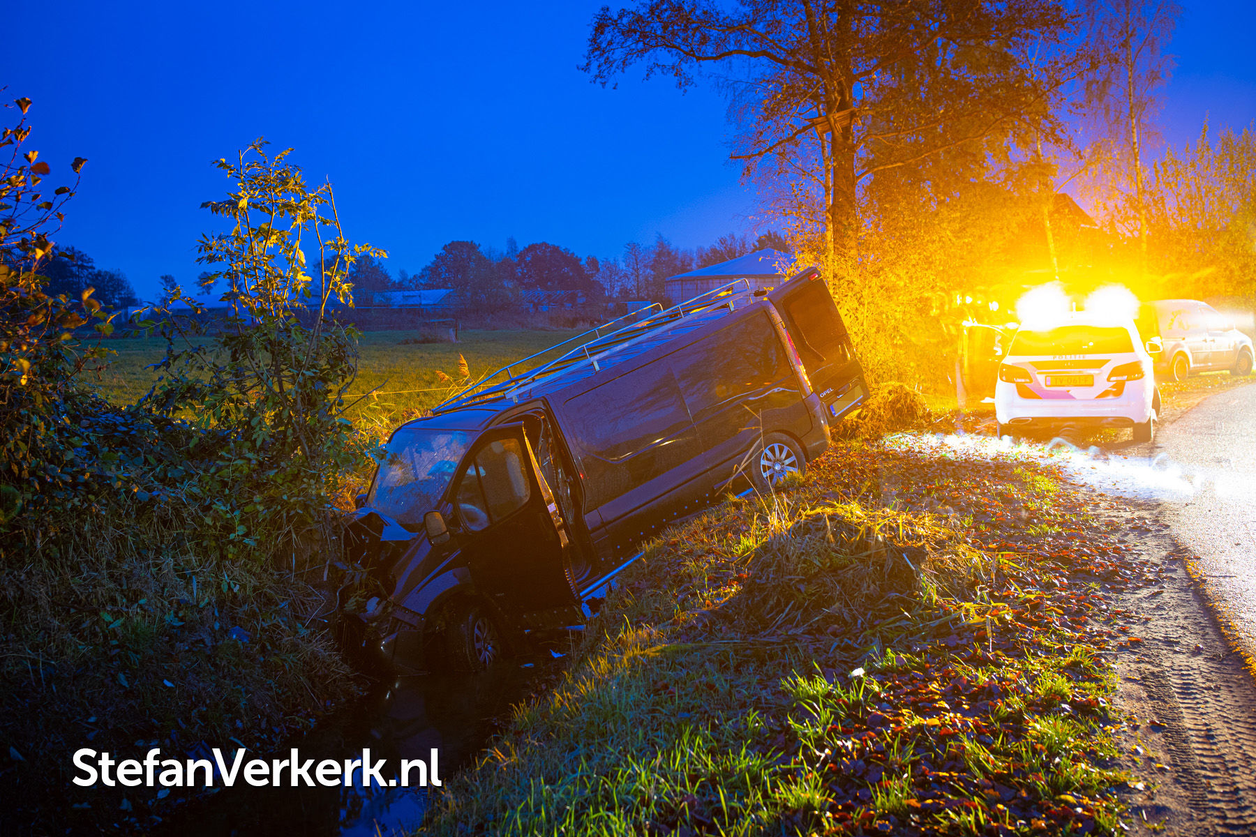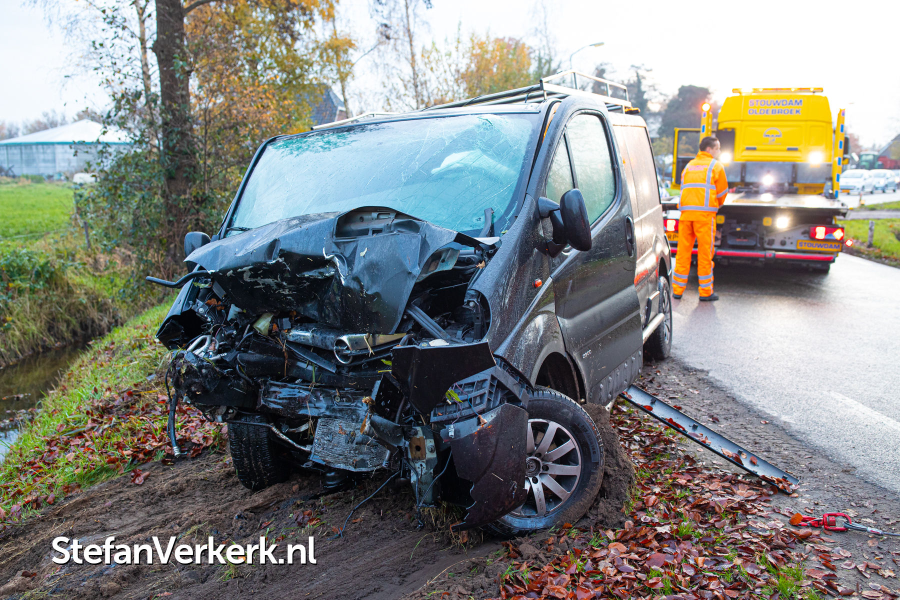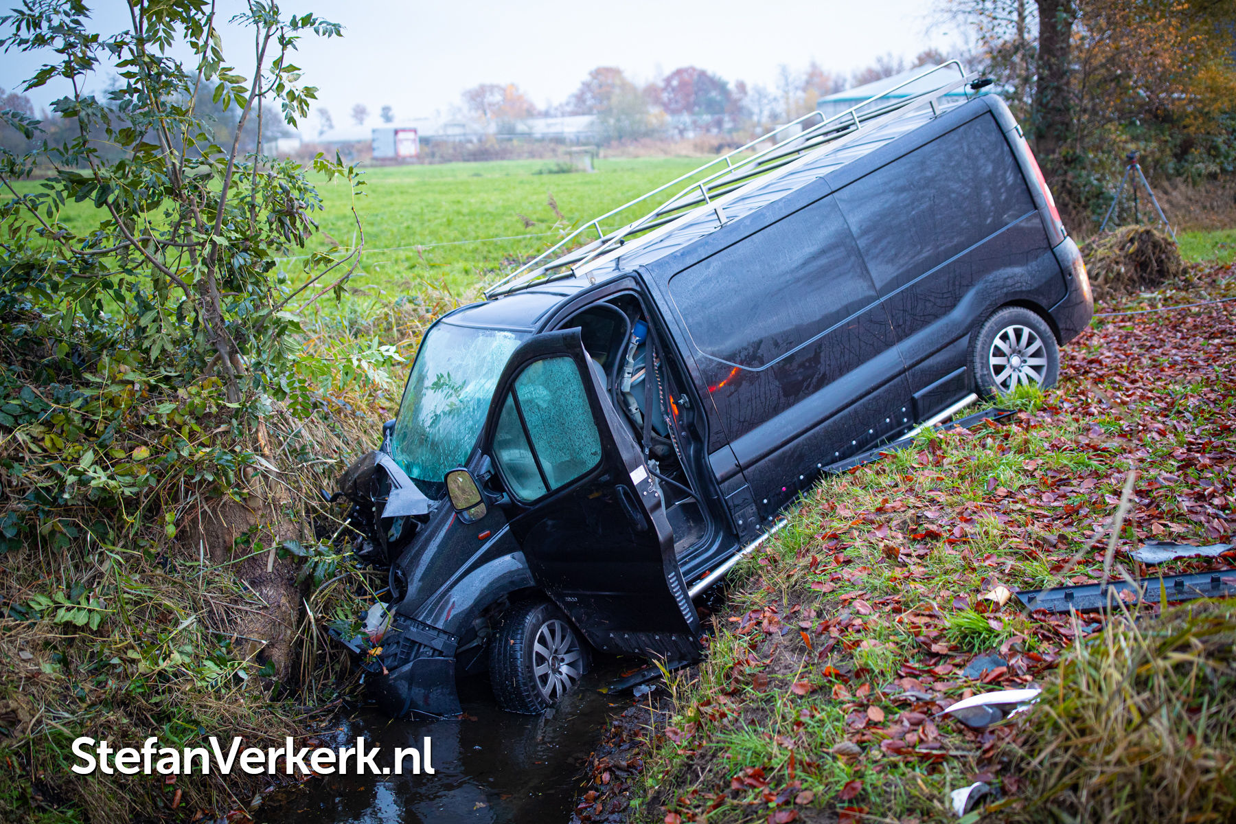 Foto's: Bedrijfsbus van de weg in sloot en tegen boomstronk Vreeweg Nunspeet