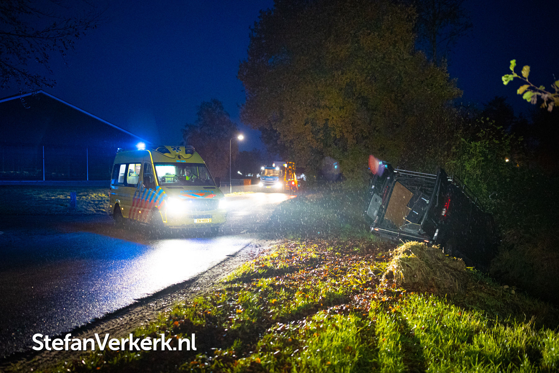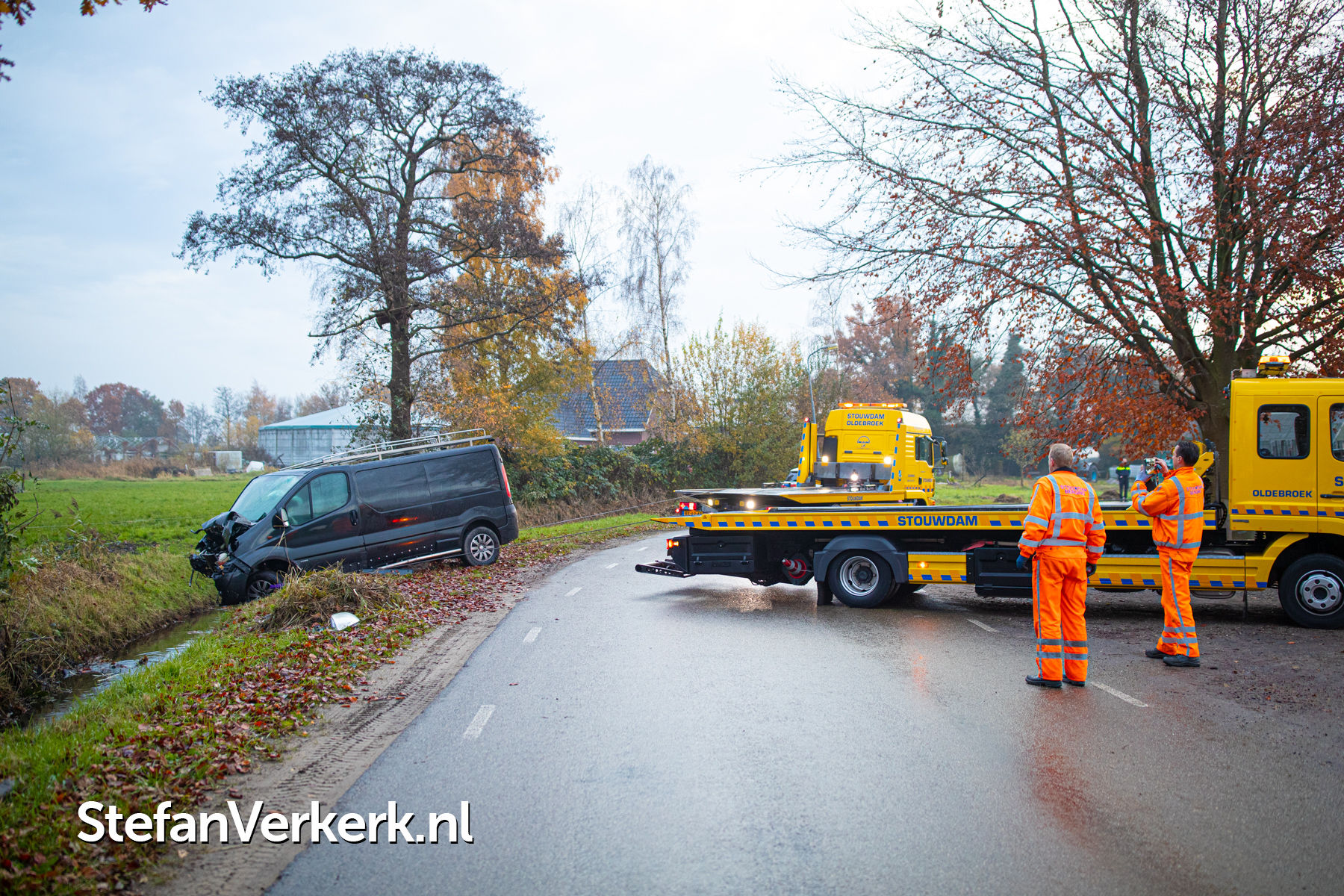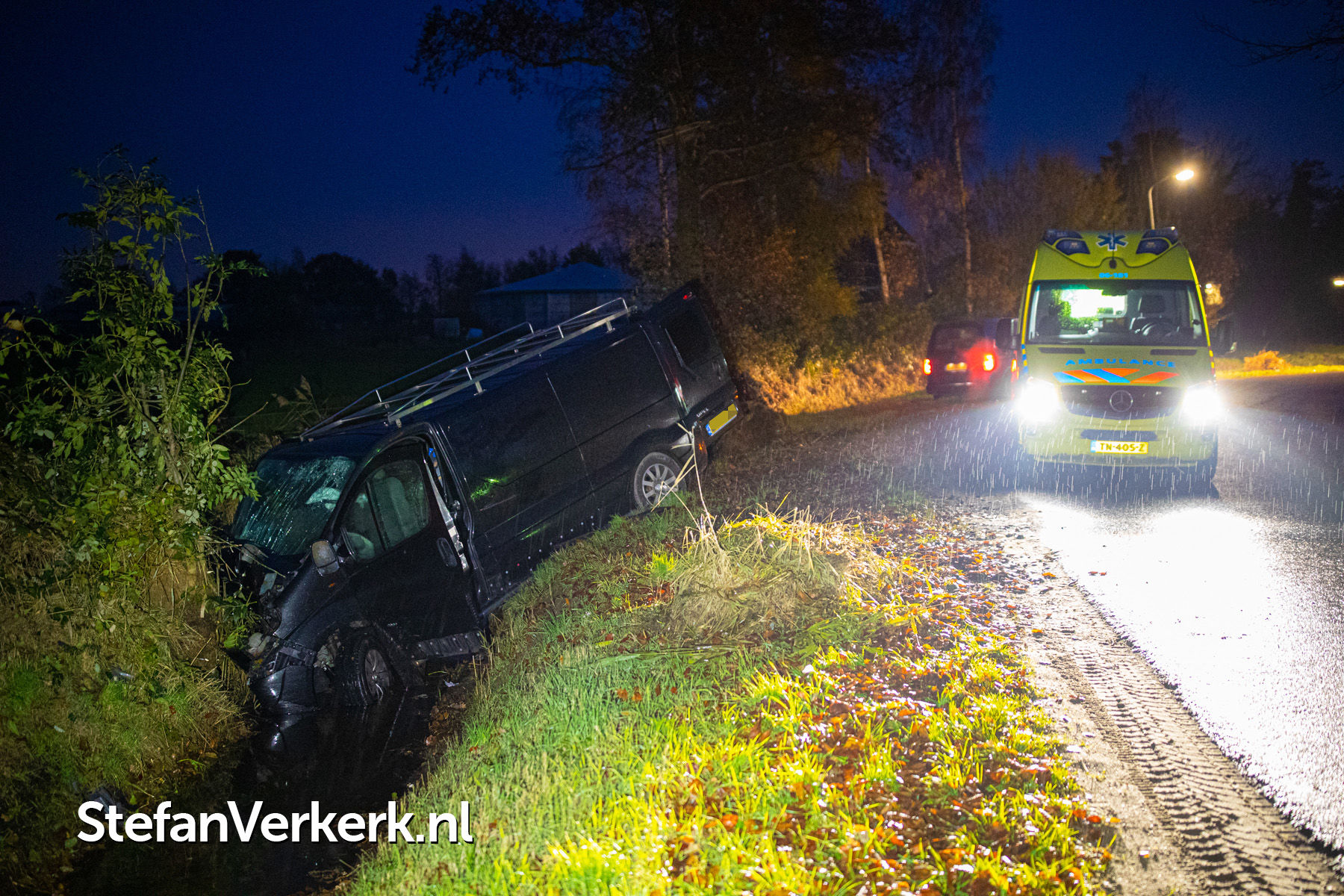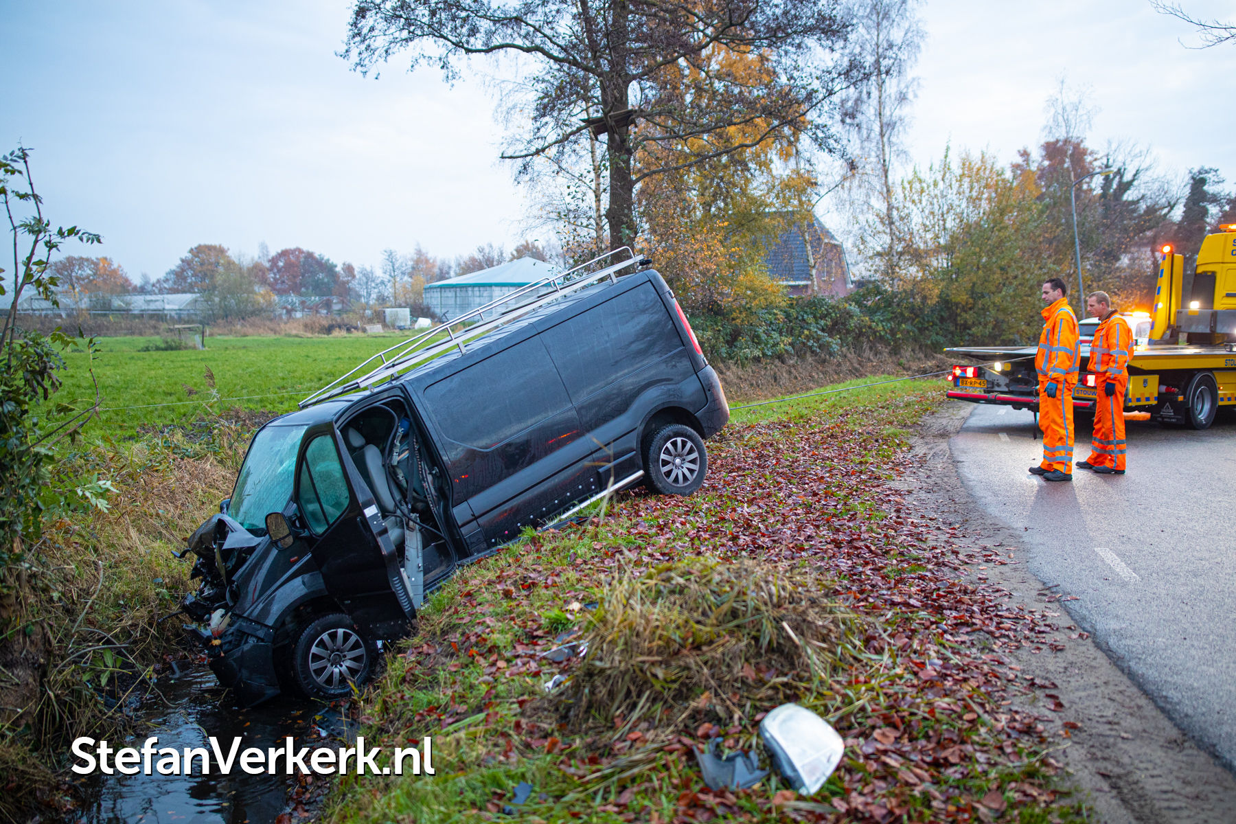 Foto's: Bedrijfsbus van de weg in sloot en tegen boomstronk Vreeweg Nunspeet